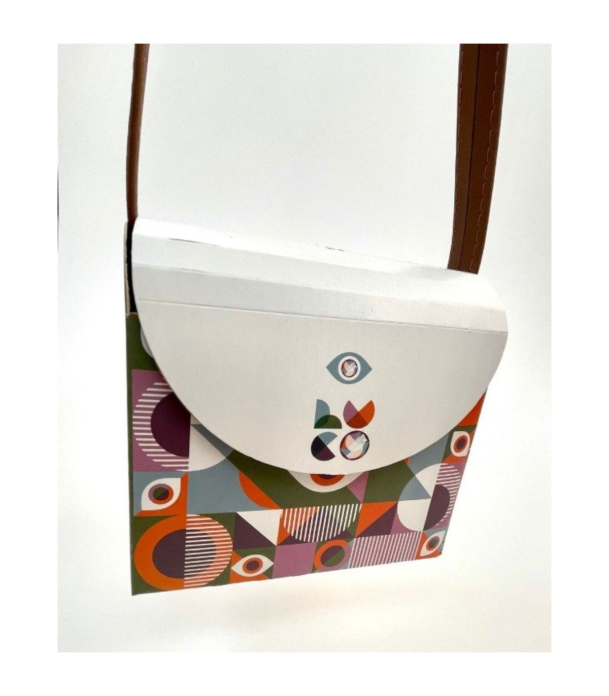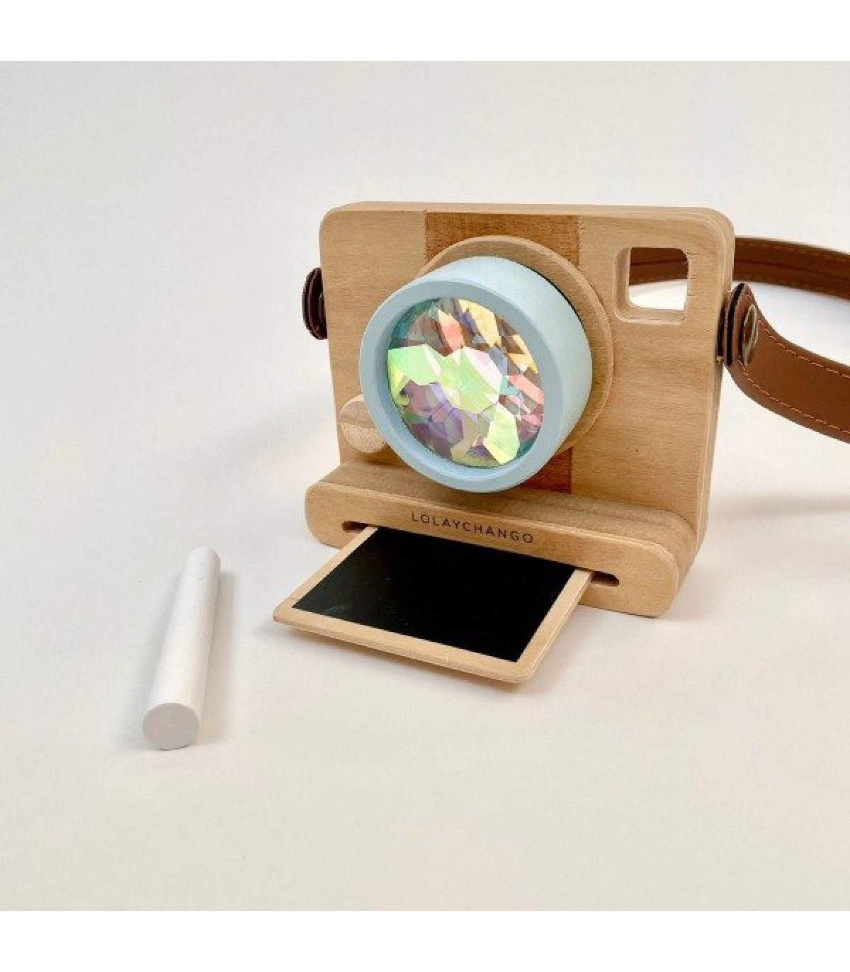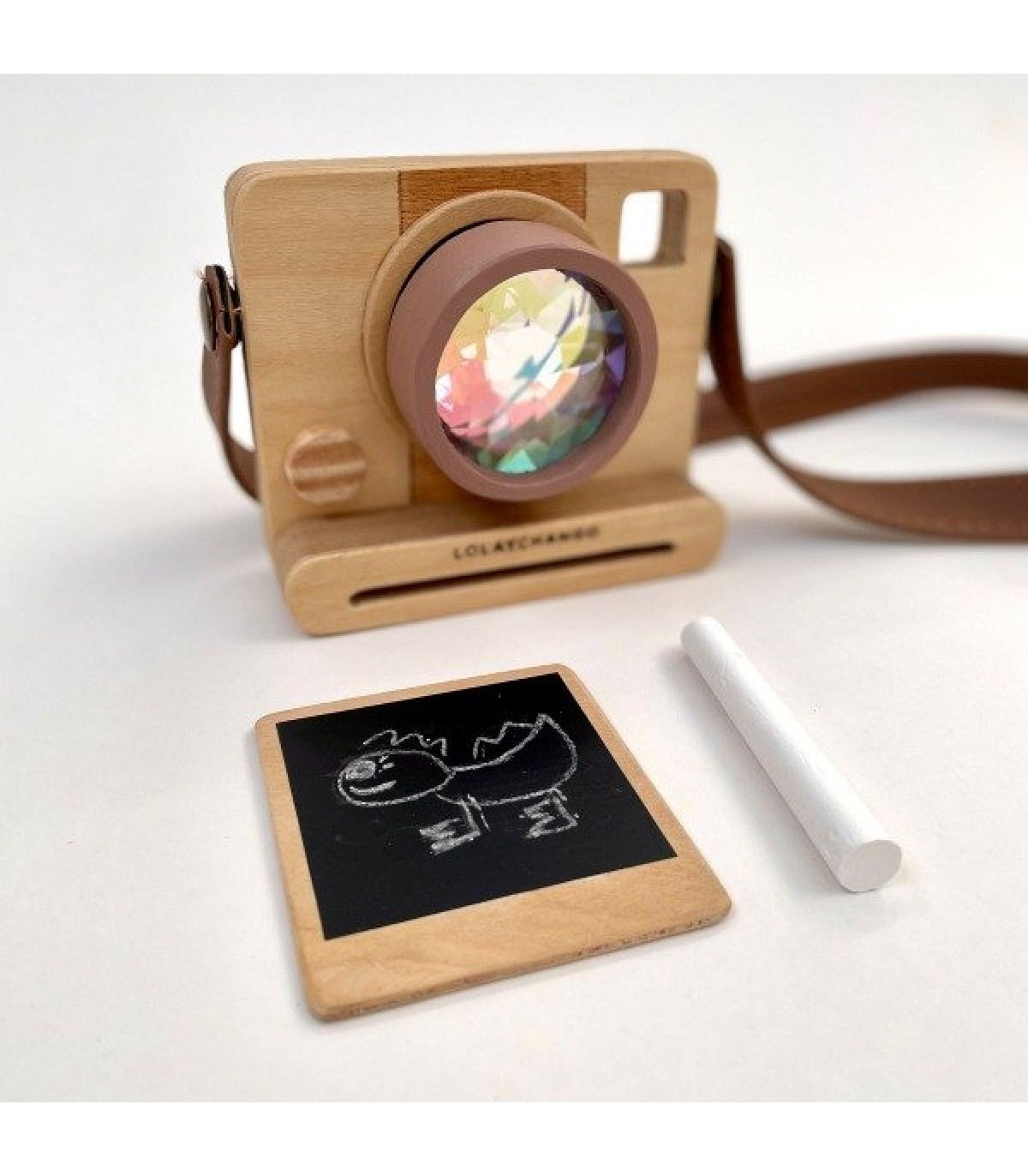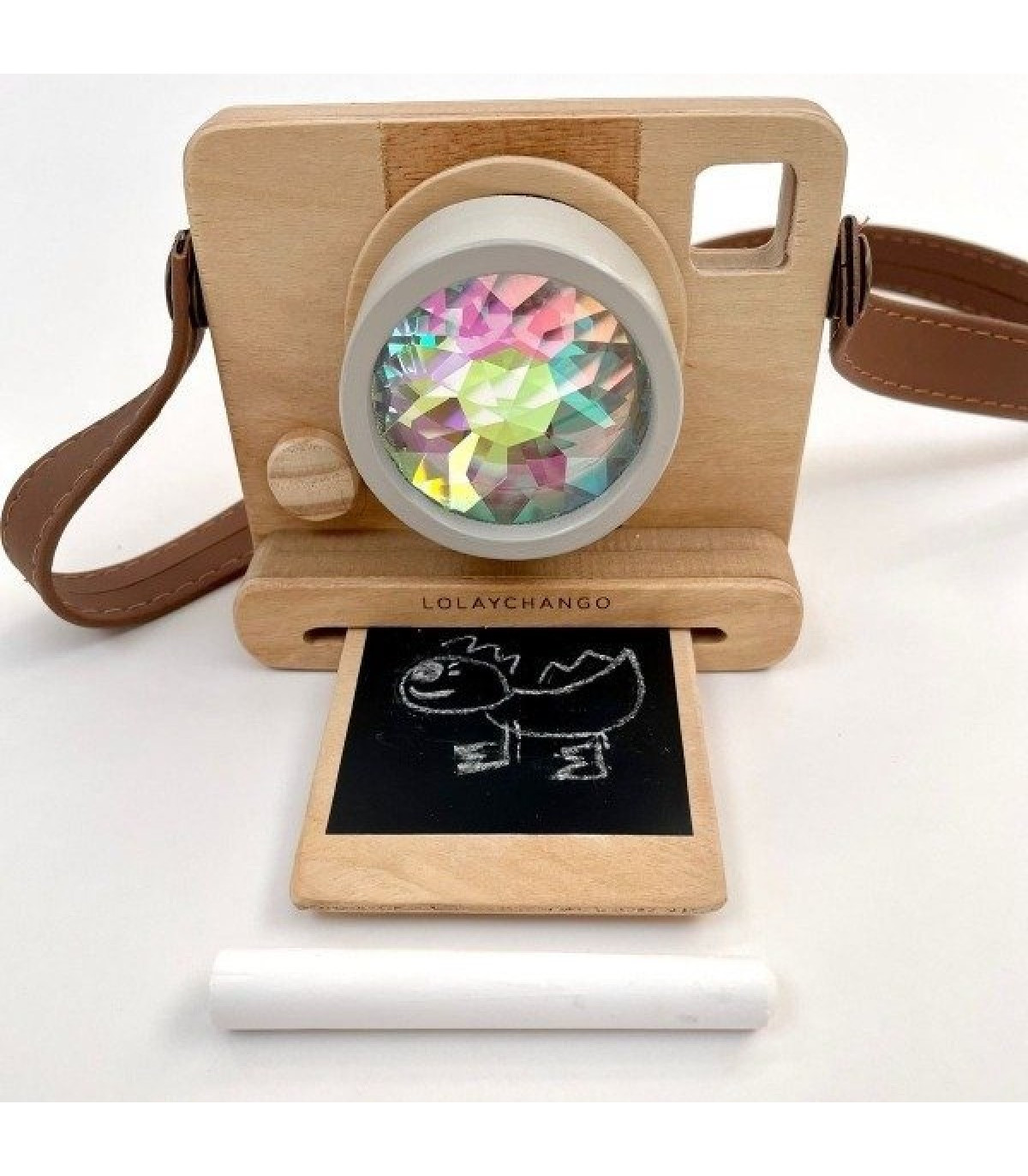 Cámara de juguete de madera con un lente caleidoscopio que gira 360 grados. Viene con una foto de pizarrón para dibujar lo que tengas en foco. La correa es de ecocuero y desmontable. A la luz, llena de todo de destellos. El packaging simula un estuche.