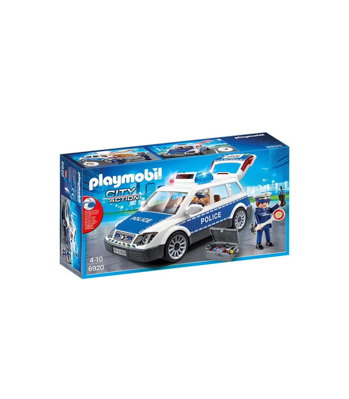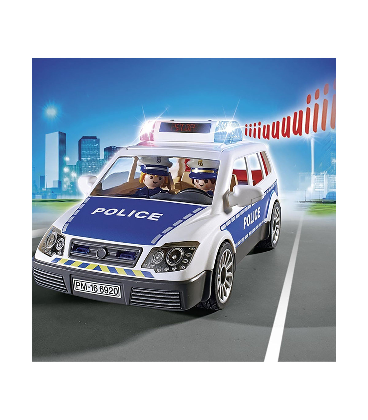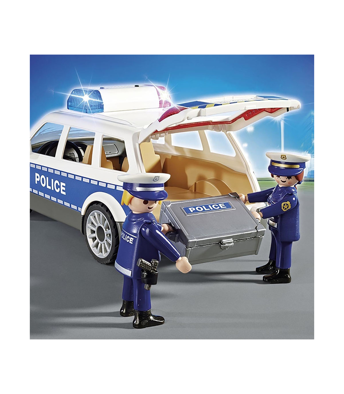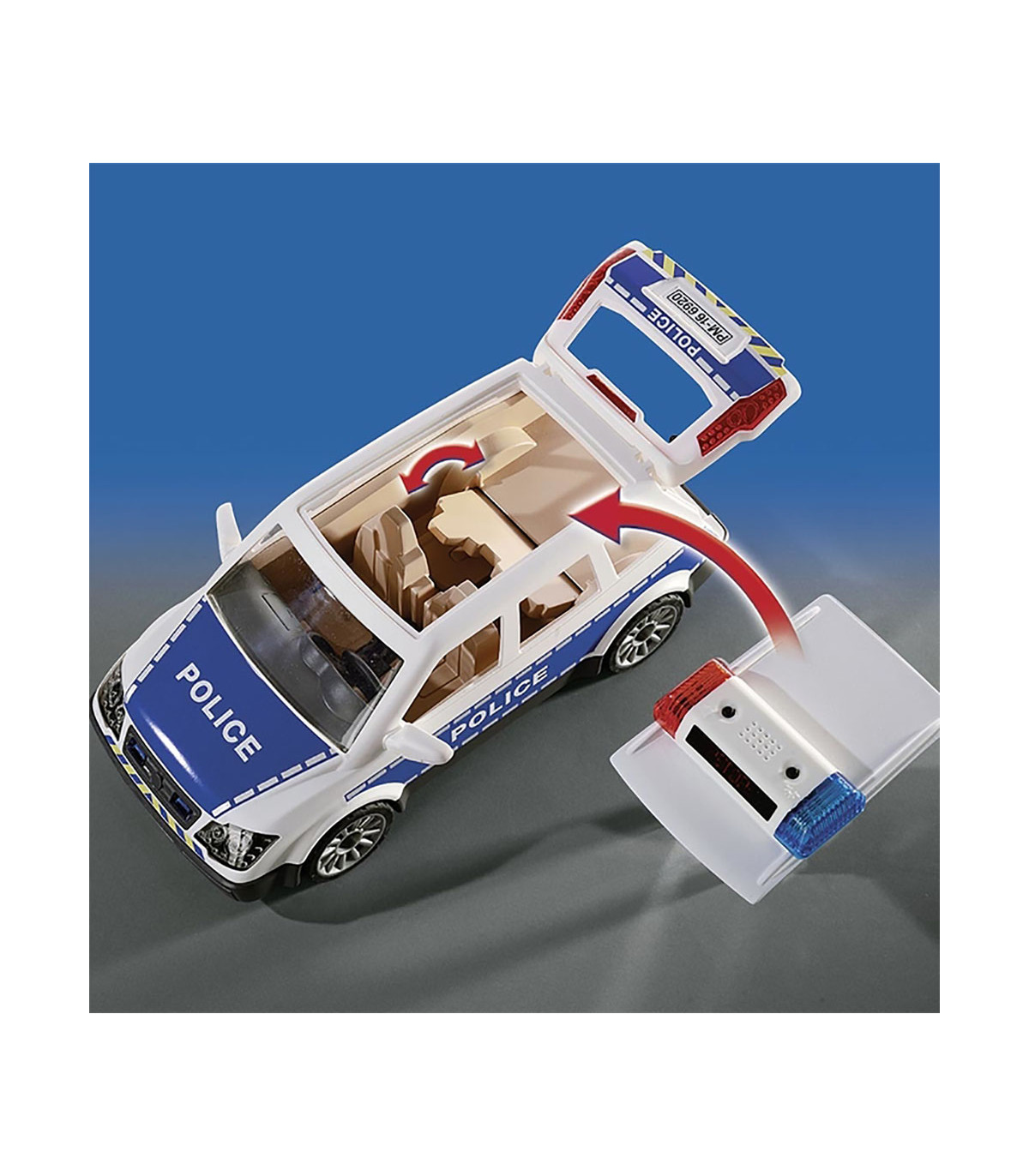 El juego incluye un coche de policía con luz y sonido, dos figuras de PLAYMOBIL, radio, megáfono, esposas, linterna y muchos otros extras. Hay dos sonidos de sirena diferentes. El techo del vehículo se puede quitar.