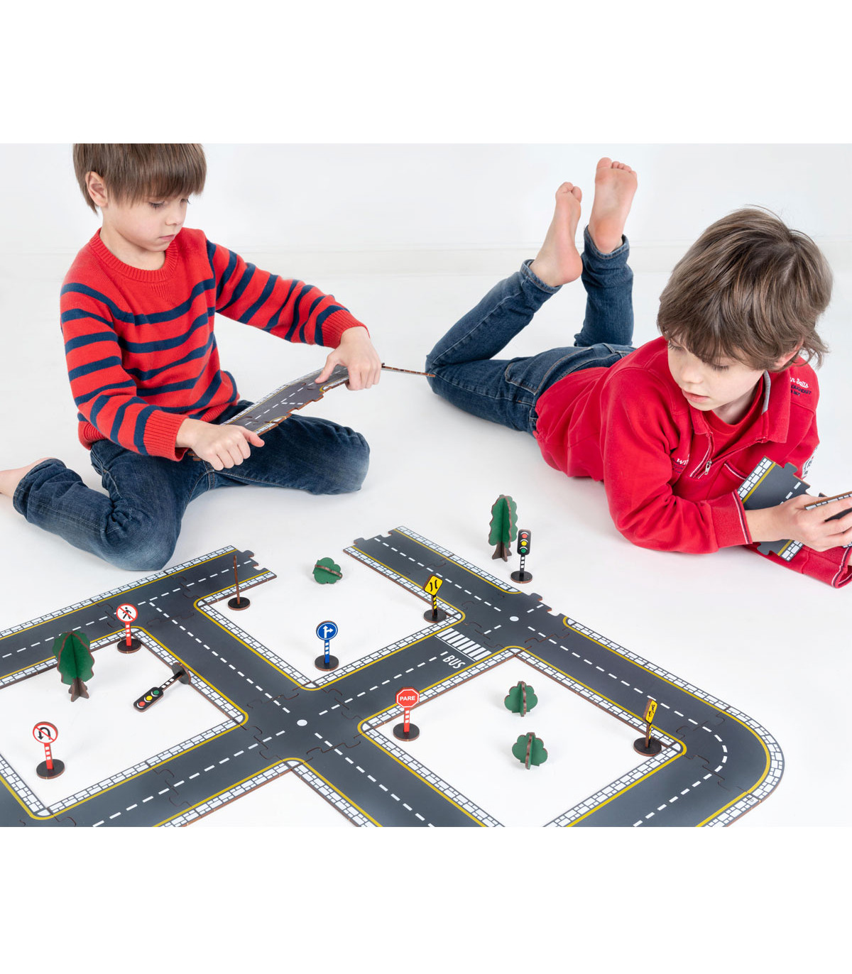 42 piezas de madera encastrables entre sí, para diseñar una ciudad. Se integra con otros juguetes para crear ciudades, lugares y escenarios. Incluye 12 rectas cortas, 6 rectas largas, 6 curvas, 2 cruces en T, 2 cruces en cruz, 2 árboles, 3 arbustos, 5 señ