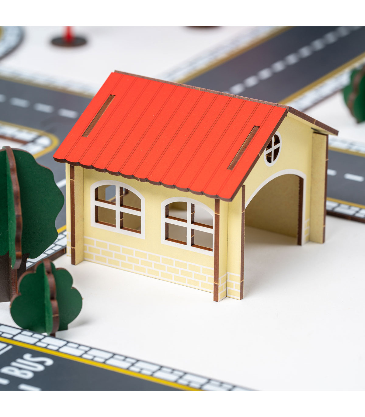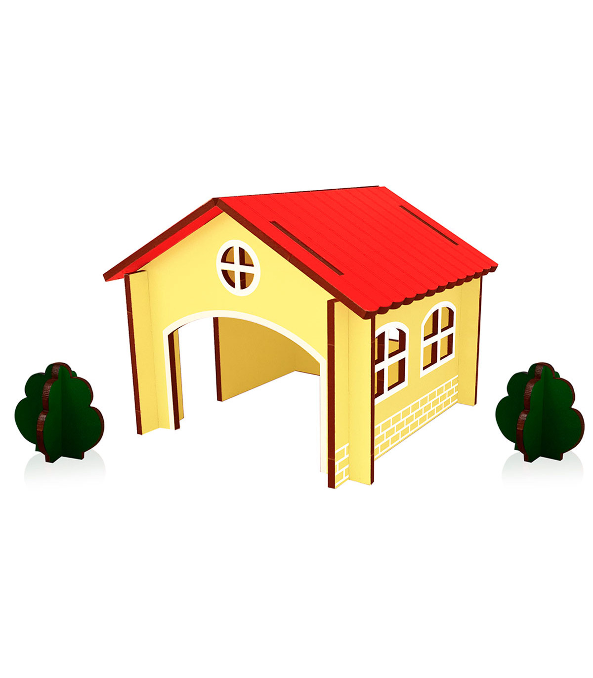 Una casa de juguete de piezas encastrables de madera para decorar tu ciudad. Incluye 2 piezas de techo, 4 paredes y 2 arbolitos para que tu ciudad crezca indefinidamente.