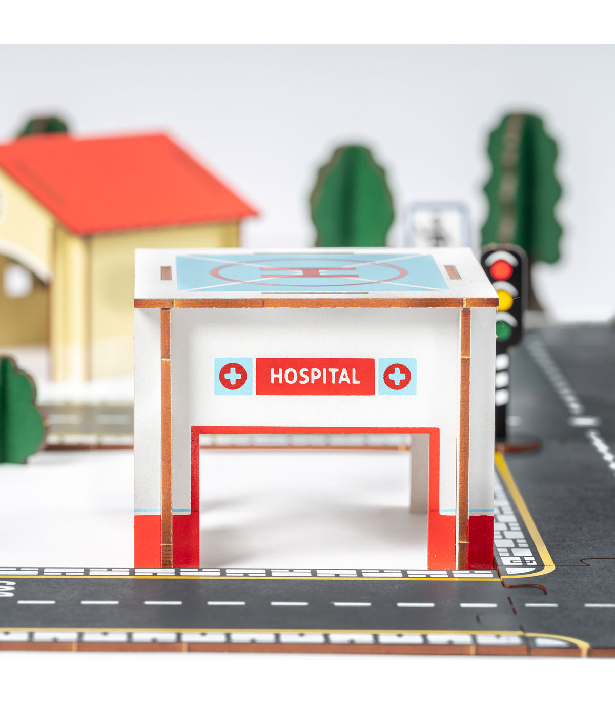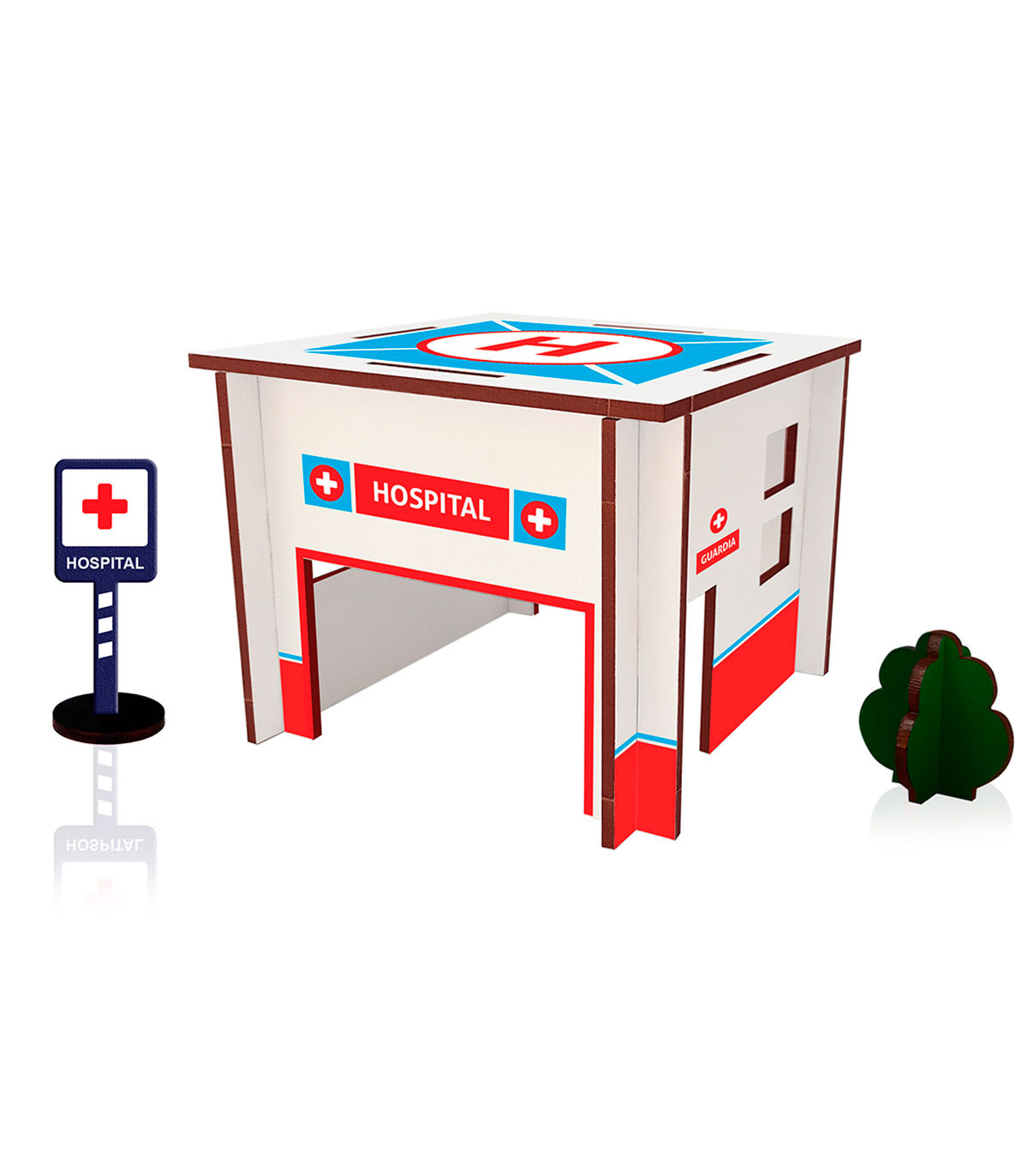 Un hospital de juguete de piezas encastrables de madera para decorar tu ciudad. Incluye 1 pieza de techo, 4 paredes, 1 arbolito y 1 señal para que tu ciudad crezca indefinidamente.