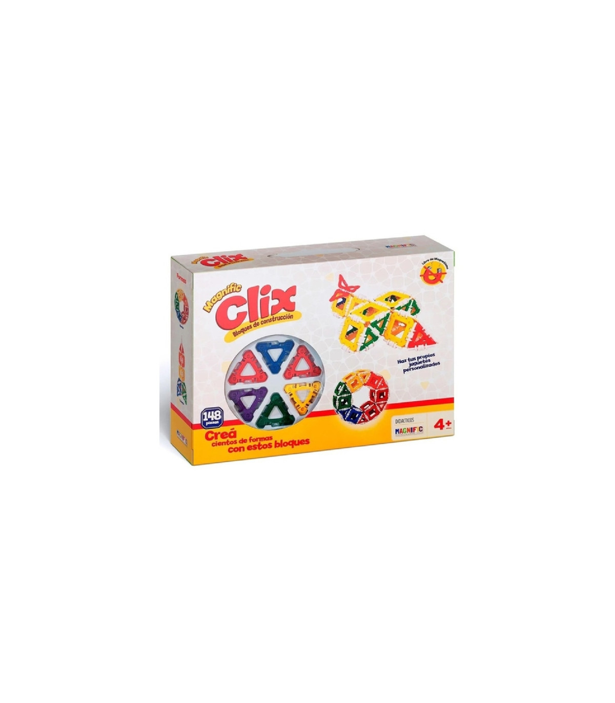 ¡Que tu imaginación y creatividad fluyan creando las más divertidas construcciones a tu gusto! Piezas Clix de construcción de Magnific para crear cientos de formas, objetos, animales y más. Formas de las piezas: Cuadrado, Triángulo, Rectángulos, Rejas, Pu