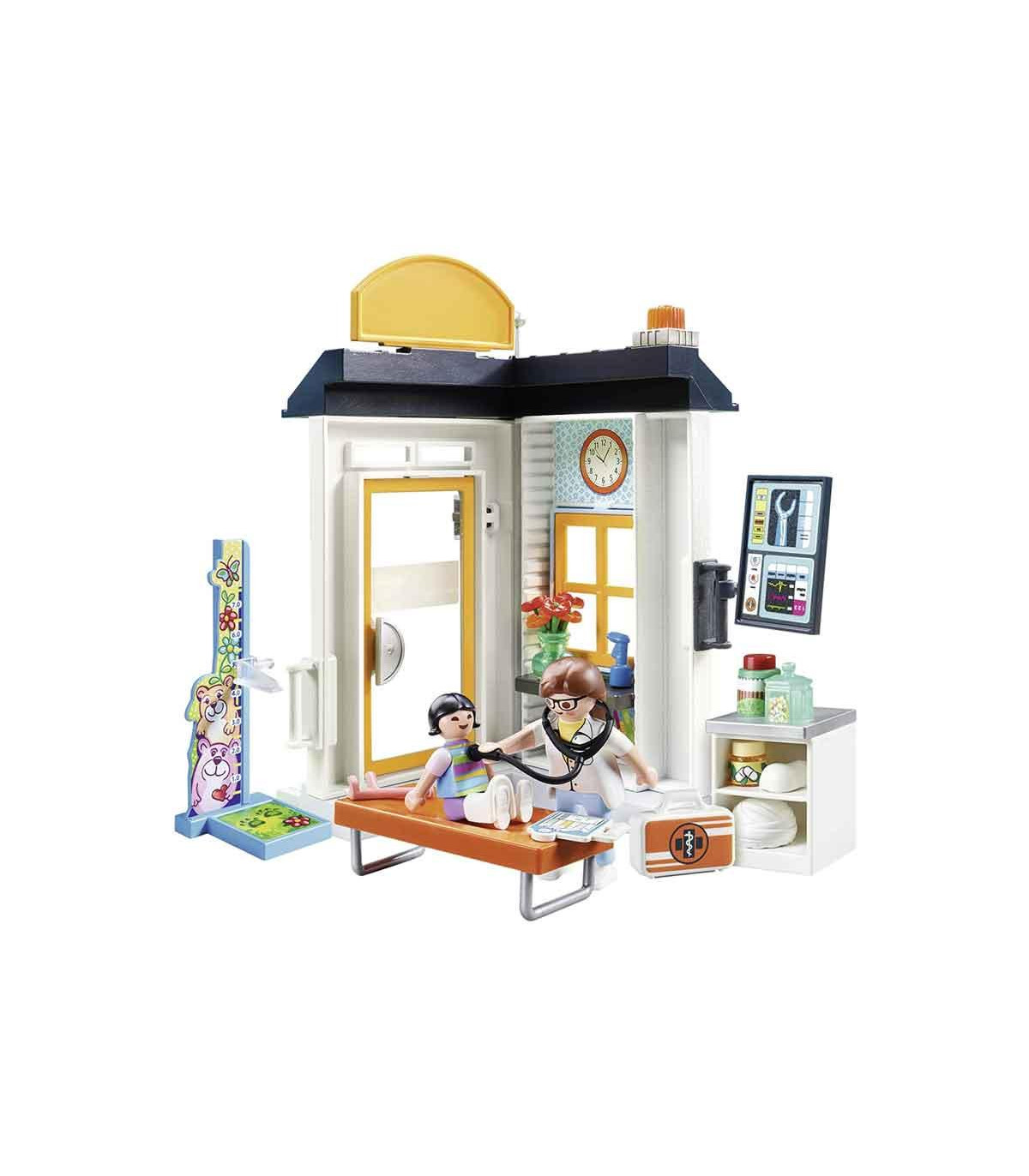 ¡La introducción perfecta a los mundos de PLAYMOBIL! El paciente joven es examinado por el pediatra y se colocan yesos. Tiempo para un chequeo en el pediatra. Párese junto a la tabla de crecimiento para ver cuánto ha crecido desde su última visita. Siéntese en la mesa de exploración para que el médico pueda escuchar los latidos de su corazón o atender una lesión. Con los stickers incluidos, los niños pueden decorar la oficina a su manera.