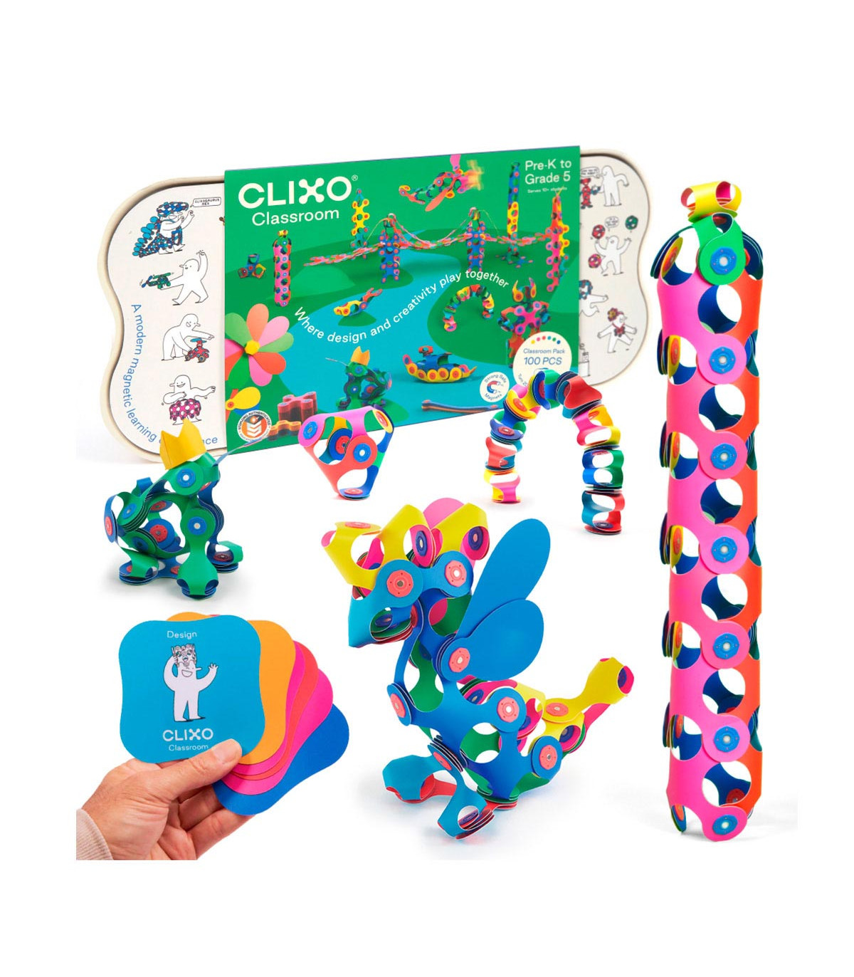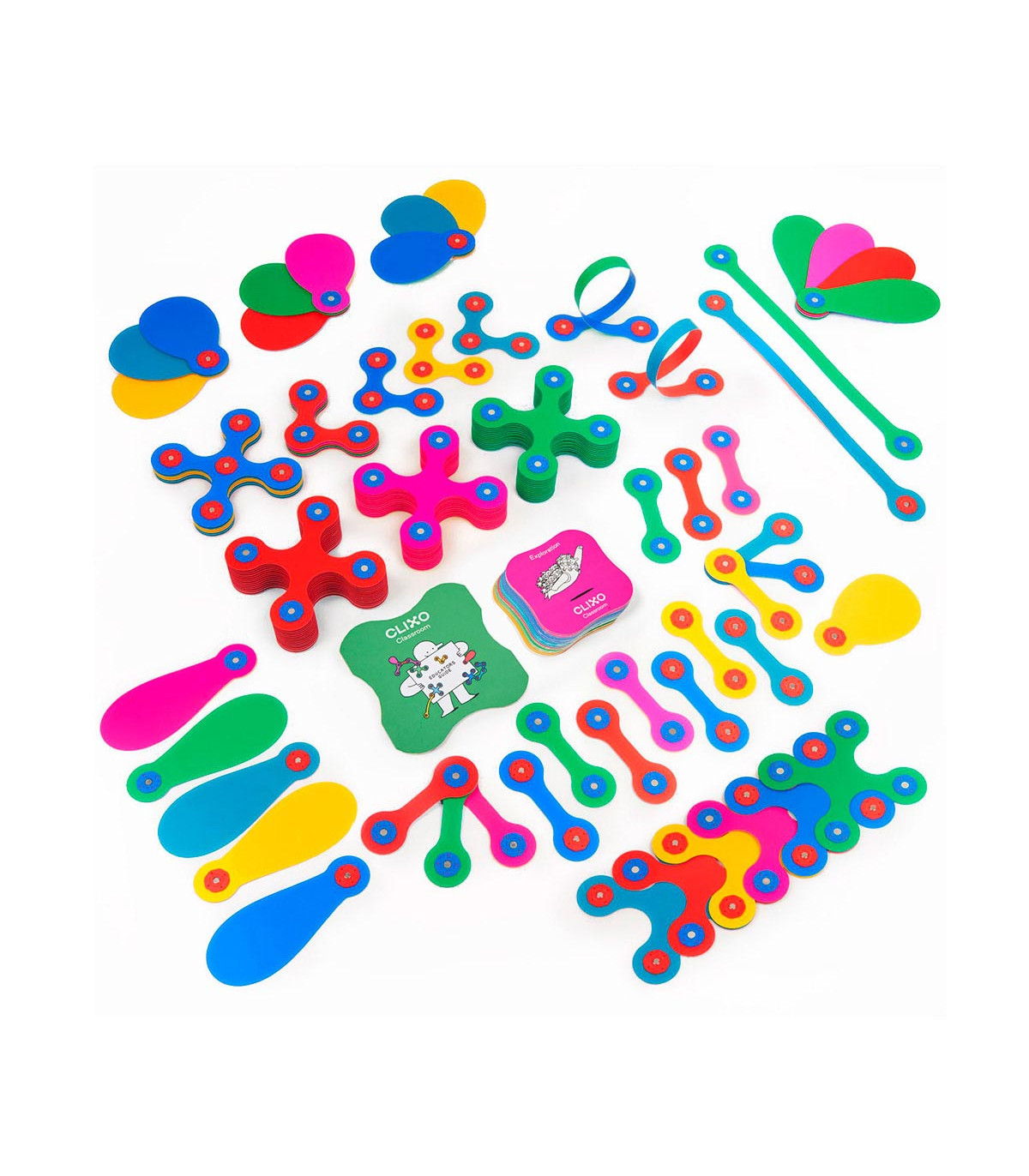 Compartí la experiencia Clixo en tu clase con 100 piezas, guía para educadores y 32 tarjetas con actividades para el juego colaborativo e independiente. Desarrolla la creatividad, habilidades STEAM, resolución de problemas y exploración sensorial.