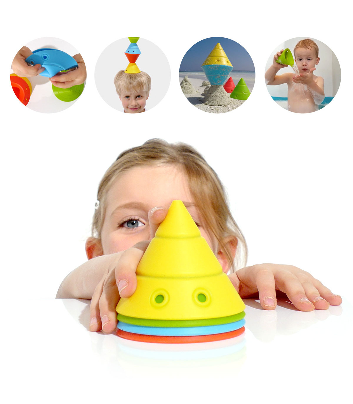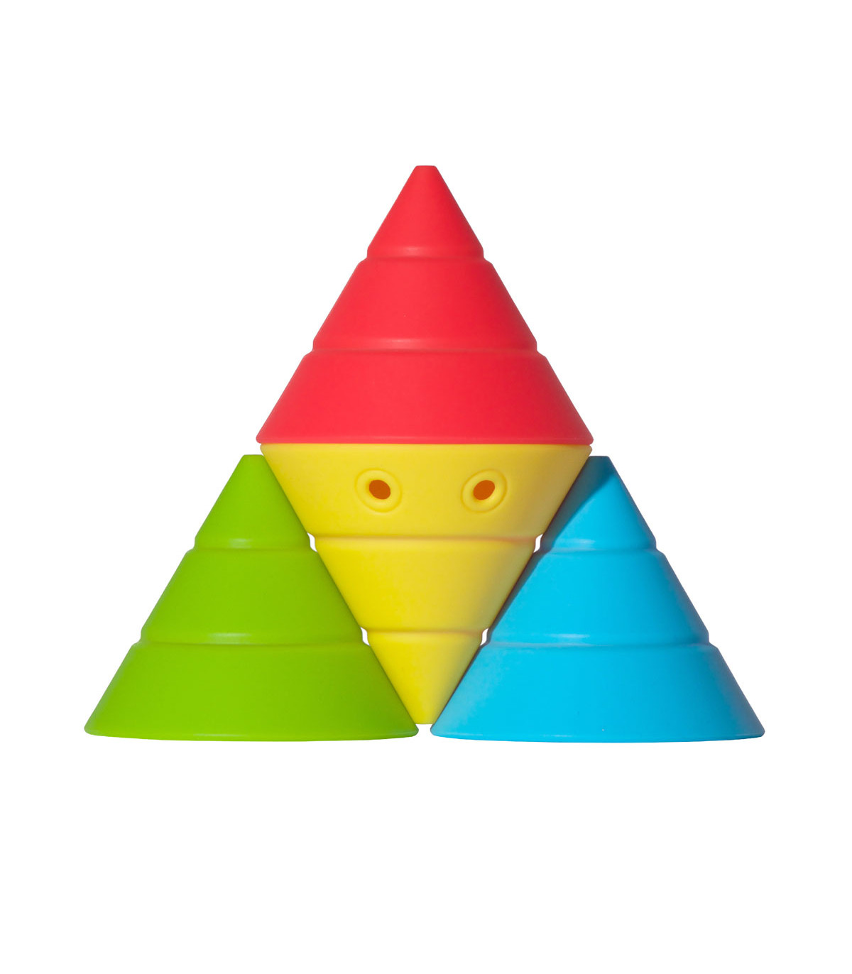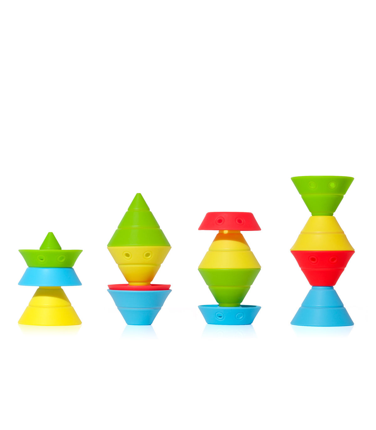 Un juego de construcción de 4 conos convertibles de silicona. Cada uno se transforma en 4 formas básicas que se pueden apilar y encajar. Hace la geometría accesible y divertida. Entrena capacidad visual-espacial, coordinación ojo-mano y motricidad fina.