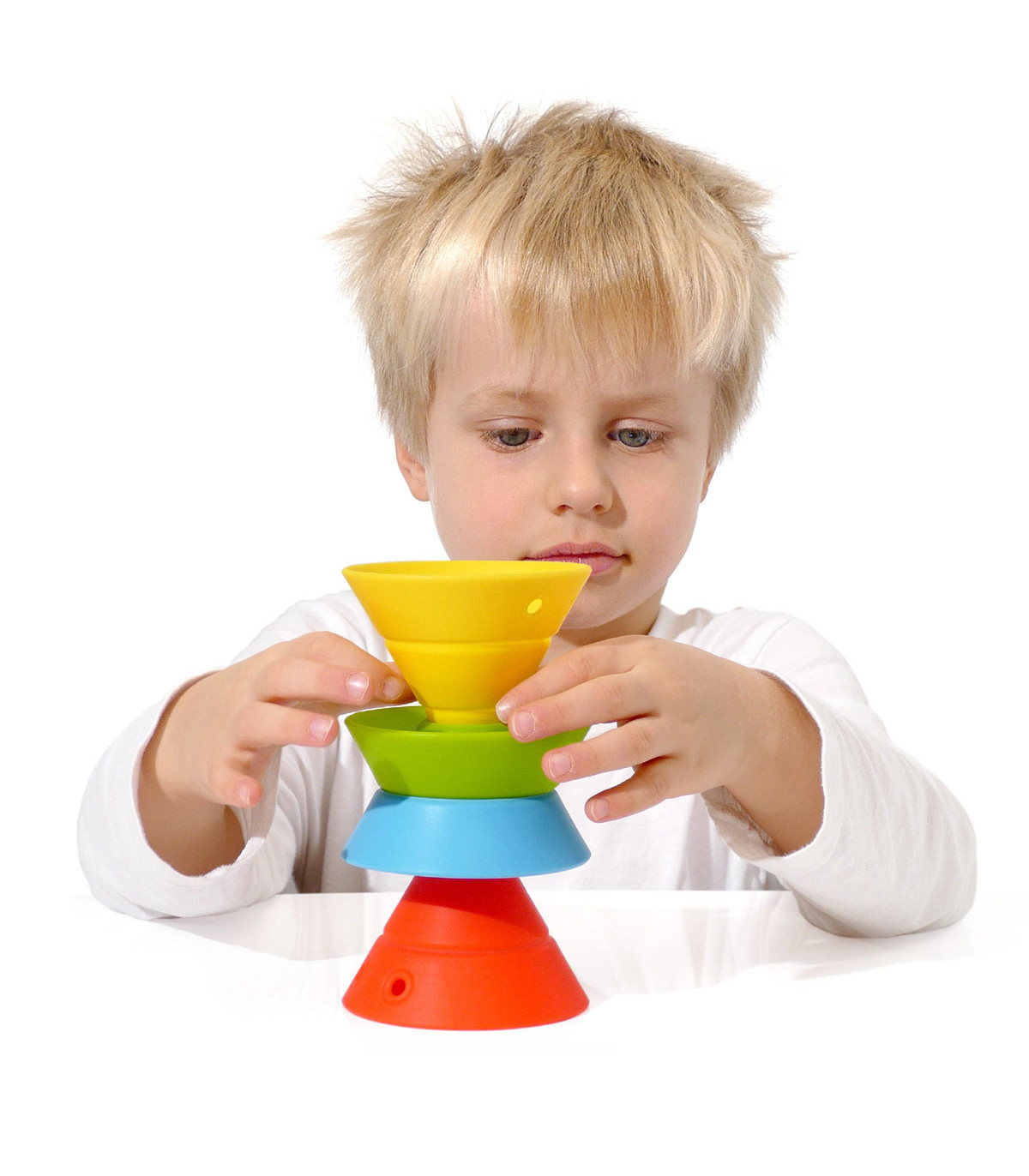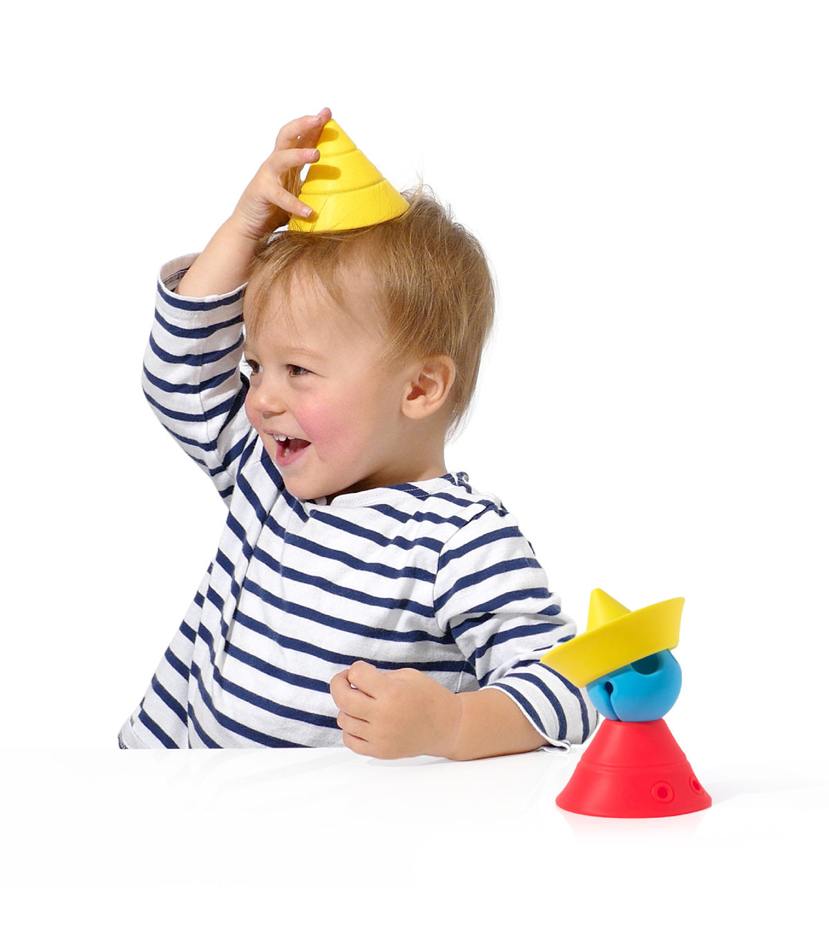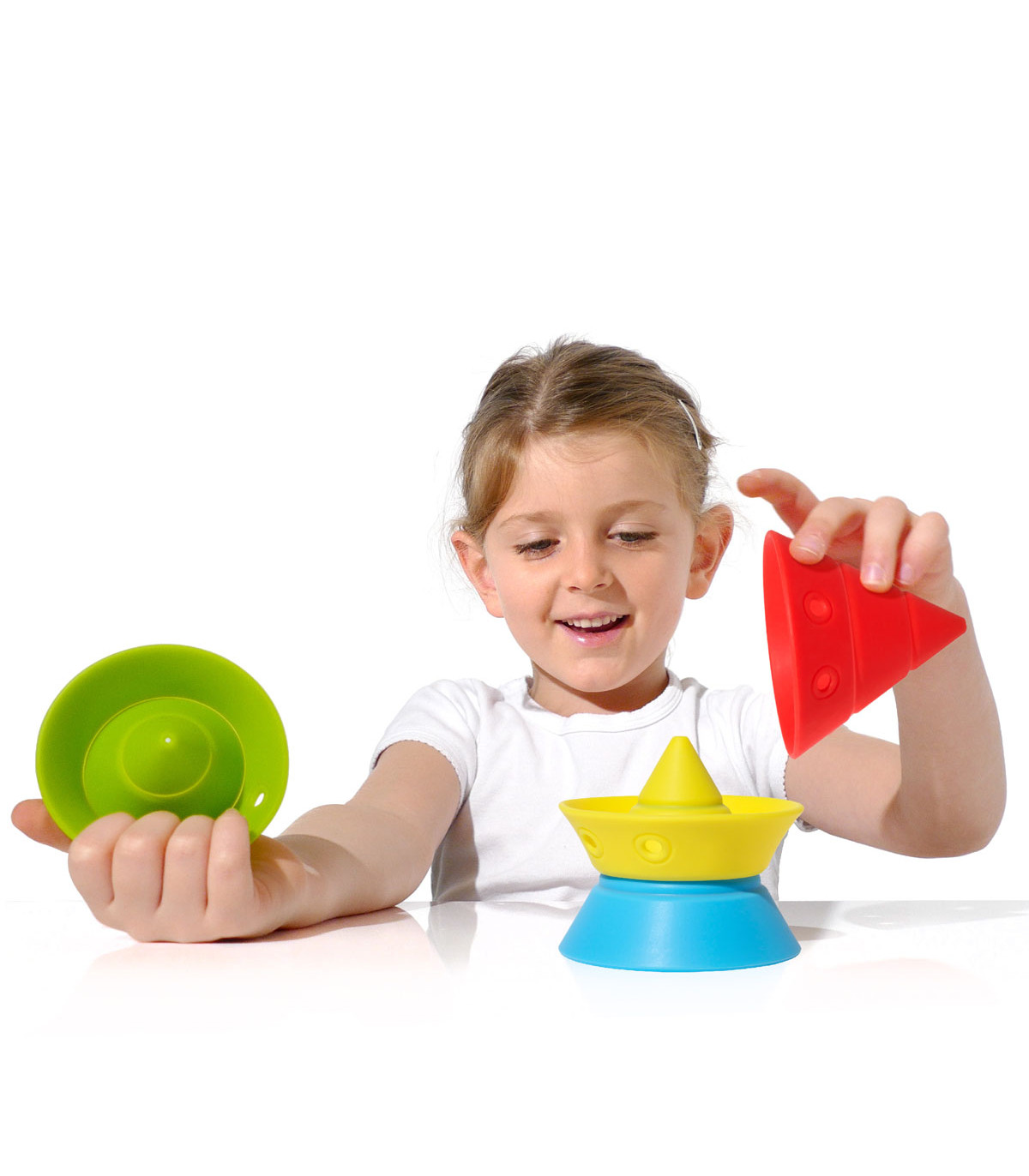 Un juego de construcción de 4 conos convertibles de silicona. Cada uno se transforma en 4 formas básicas que se pueden apilar y encajar. Hace la geometría accesible y divertida. Entrena capacidad visual-espacial, coordinación ojo-mano y motricidad fina.