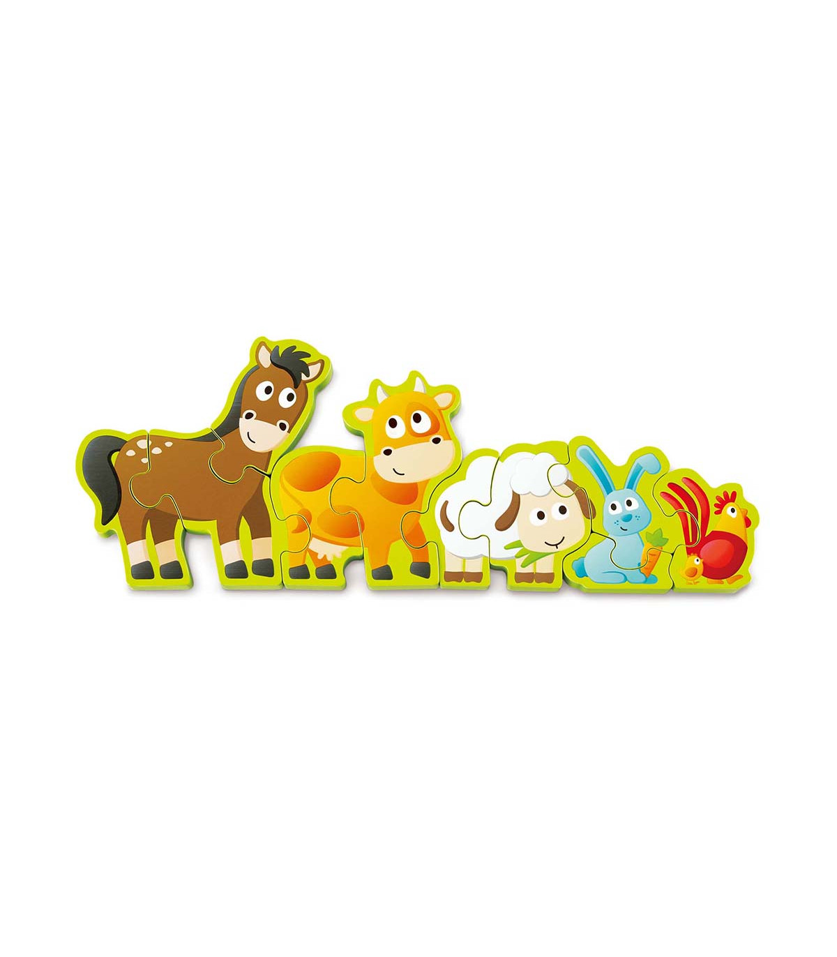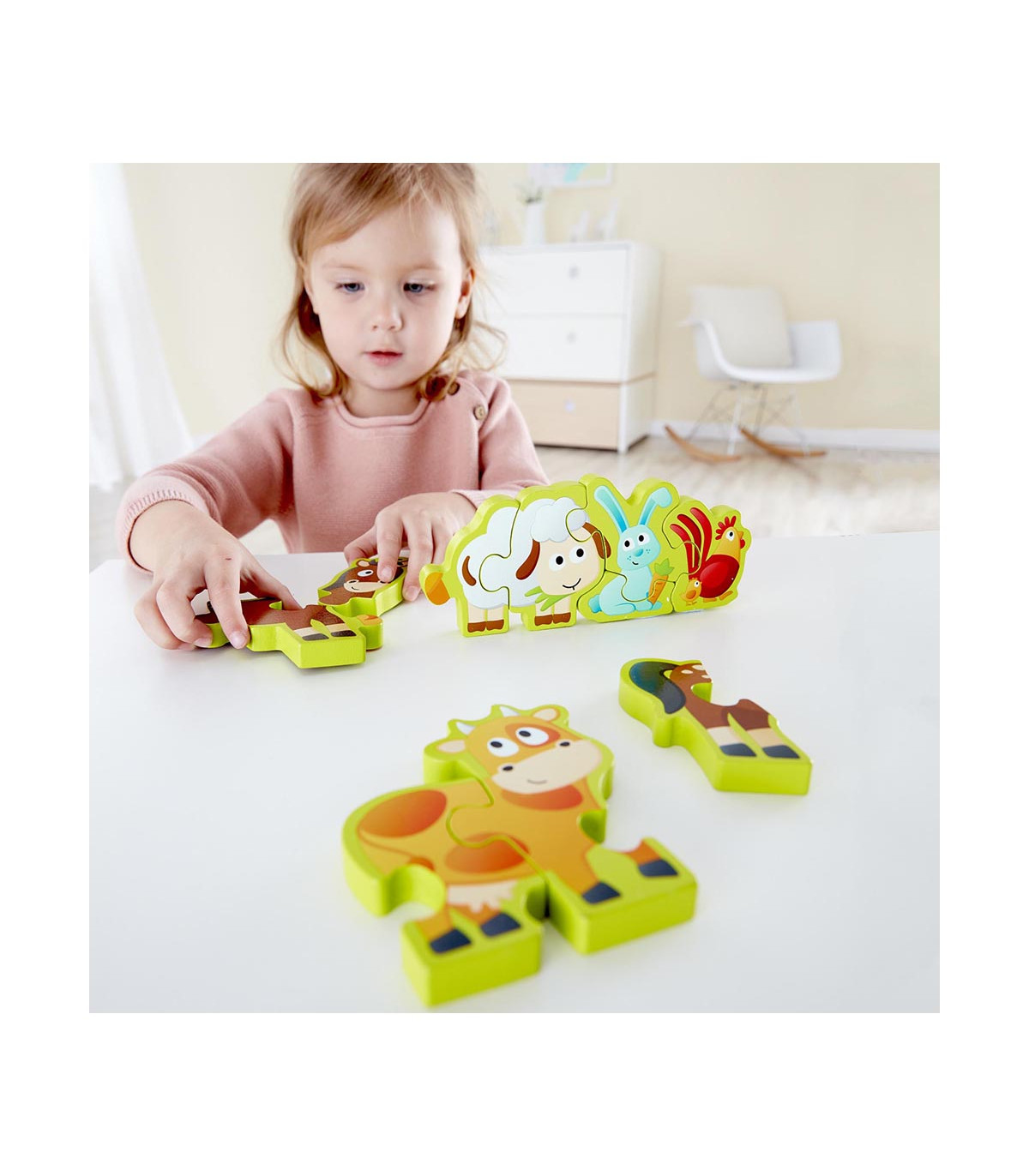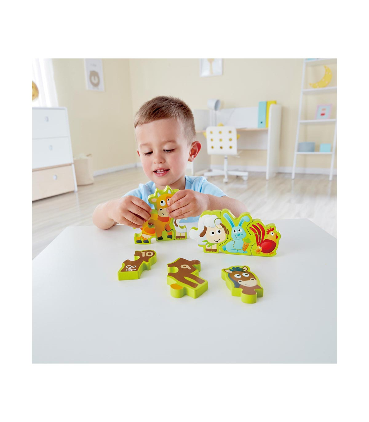 Rompecabezas de madera de 10 piezas hermosamente diseñado con animales de granja en un lado y los números del 1 al 10 en el otro. El rompecabezas permanece vertical sobre la mesa.