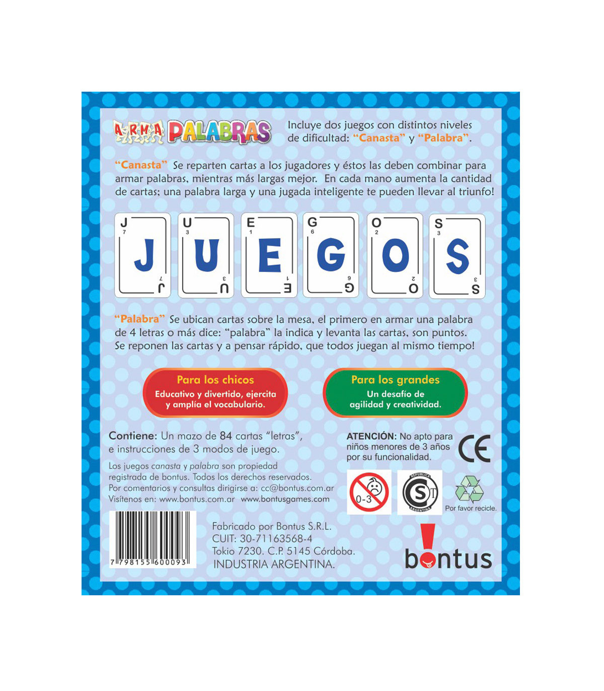 Un juego dinámico y entretenido de armar palabras. Incluye 2 juegos con distintos niveles de dificultad. Para los chicos, educativo, divertido y amplía el vocabulario. Para los grandes, un desafío de agilidad y creatividad. Edad: a partir de los 6 años.