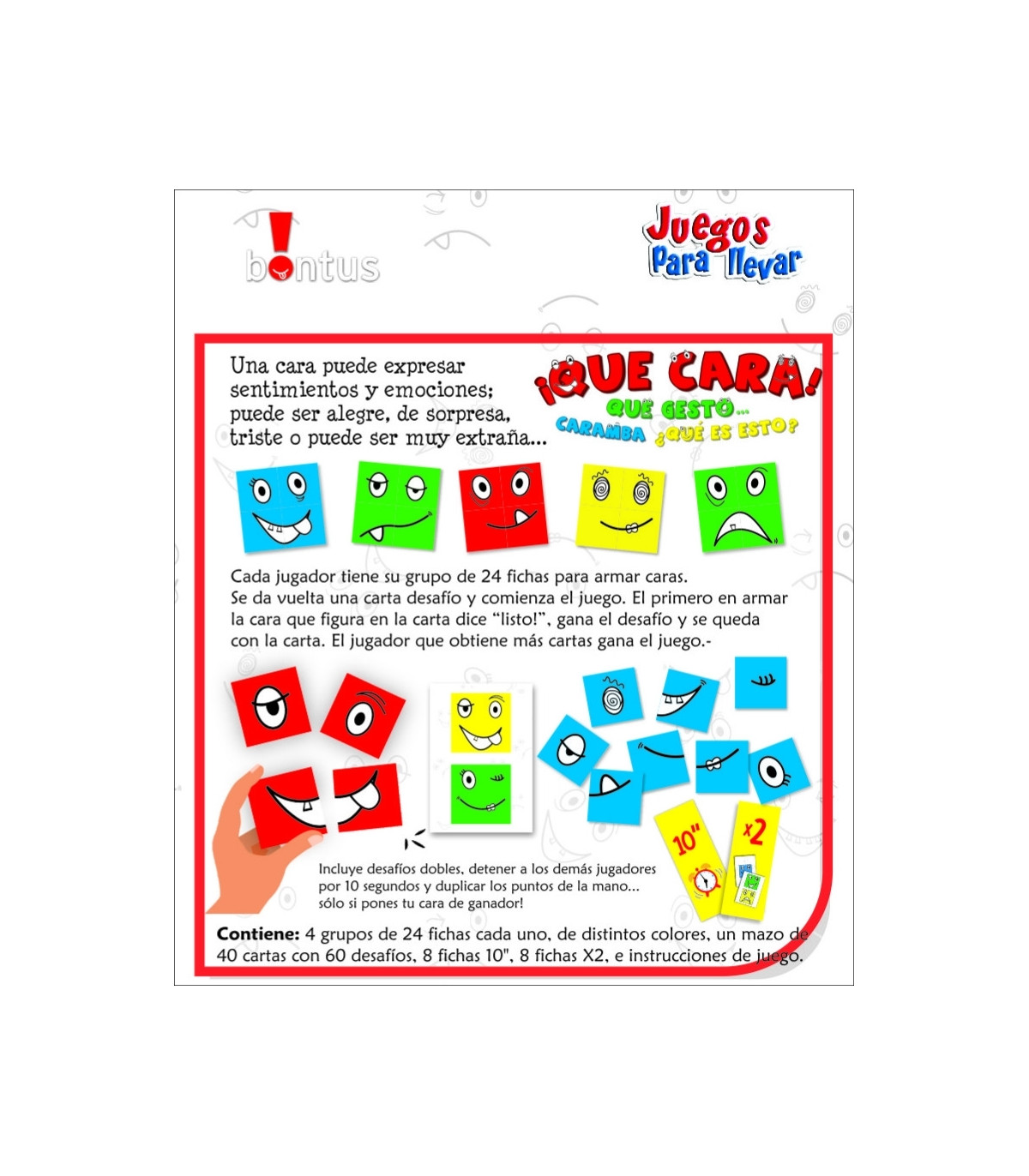 Un juego para armar caras con distintas emociones. Cada jugador tiene fichas para armar la cara desafío. El primero en armarla gana la cara. El jugador con más caras gana. Incluye desafíos dobles, detener al resto 10 segundos y duplicar los puntos.