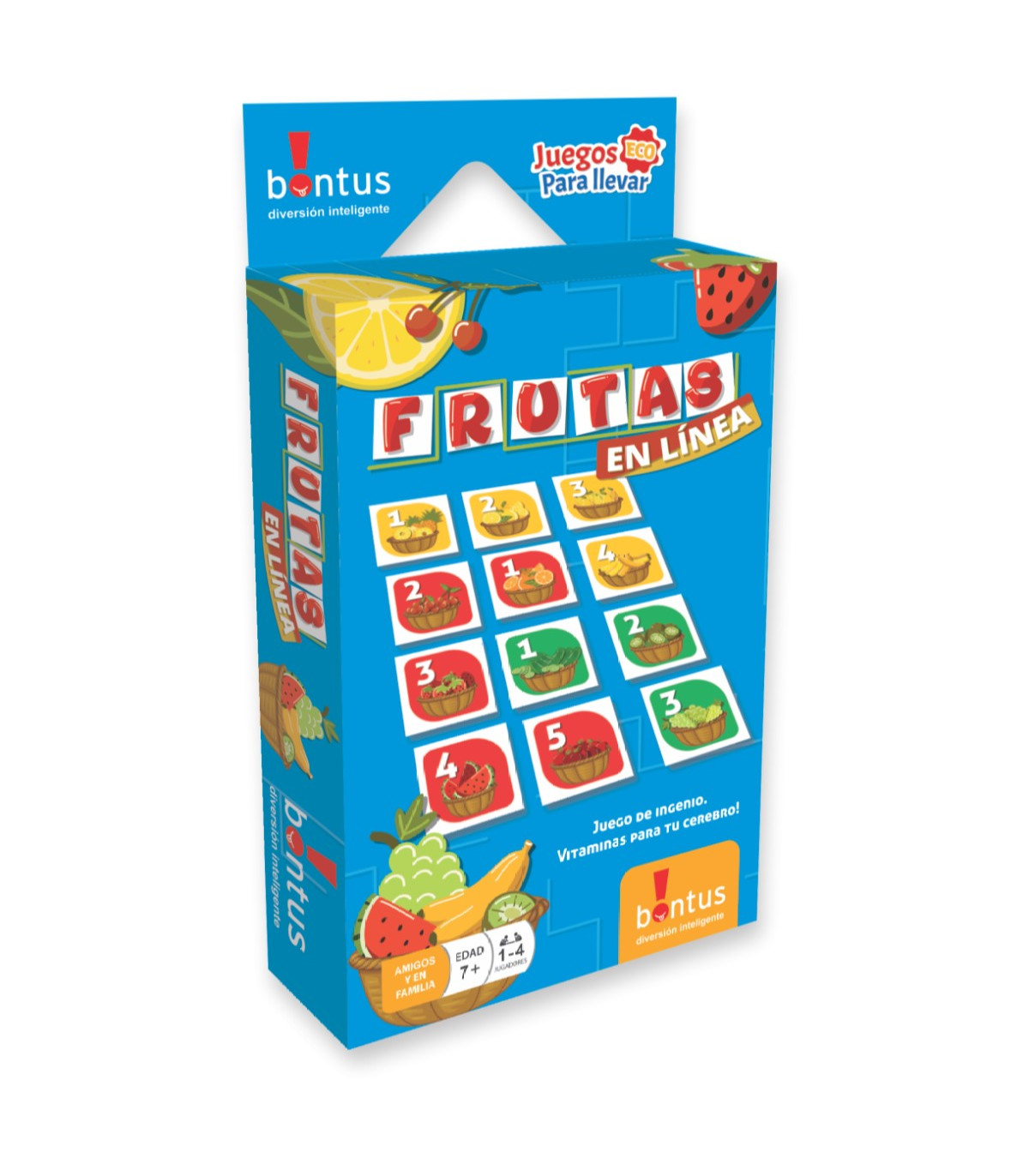 Ubicá todas las frutas para obtener vitaminas en el tablero ordenadas por color y por números. Las cartas desafío proveen algunas pistas. El desafío es ubicar todas las frutas y en línea sobre el tablero. 1 a 4 jugadores a partir de los 7 años.