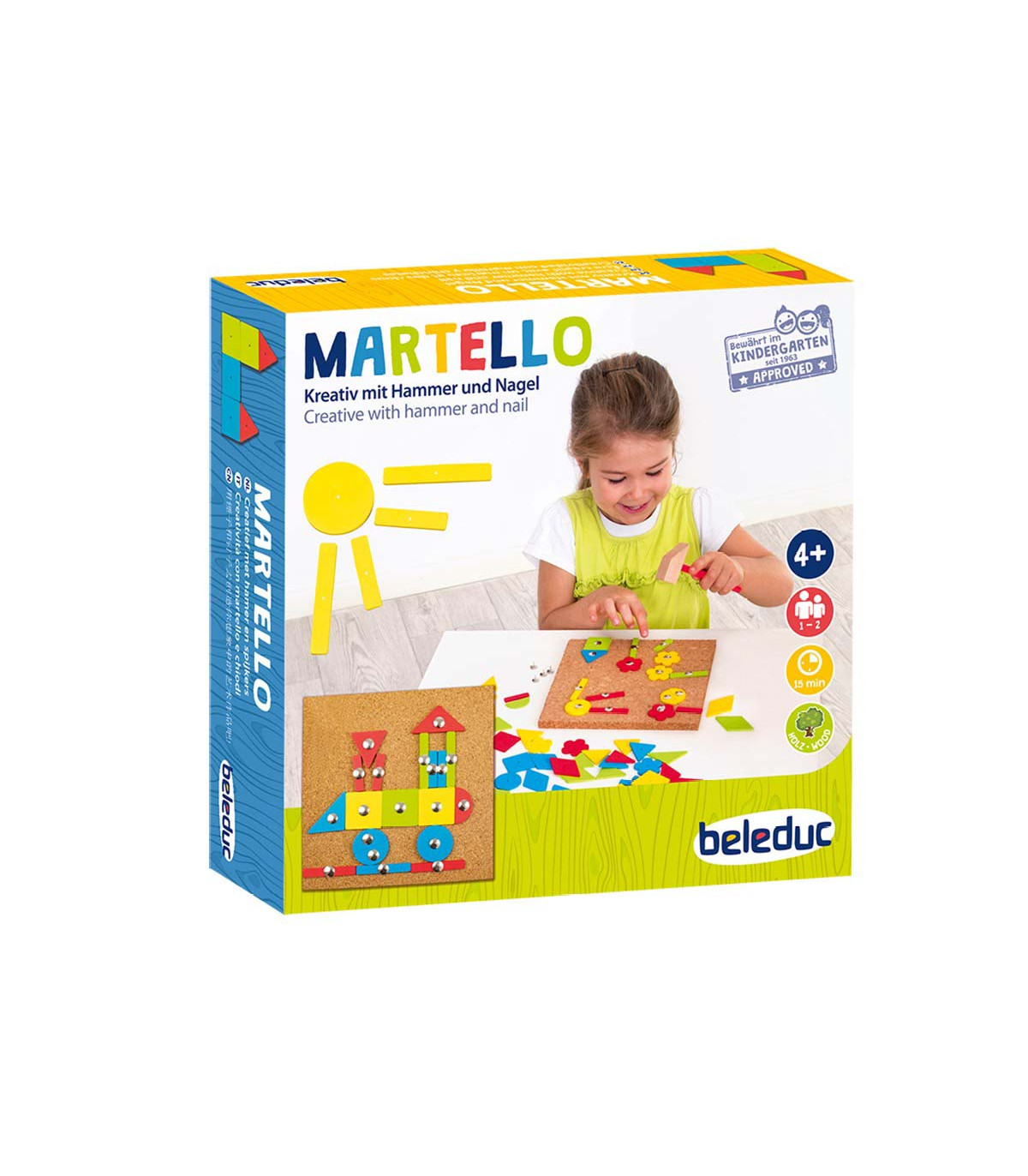 Usá el martillo y los clavos de madera para fijar las figuras en las planchas de corcho. Quitar todas las piezas después es igual de fácil.