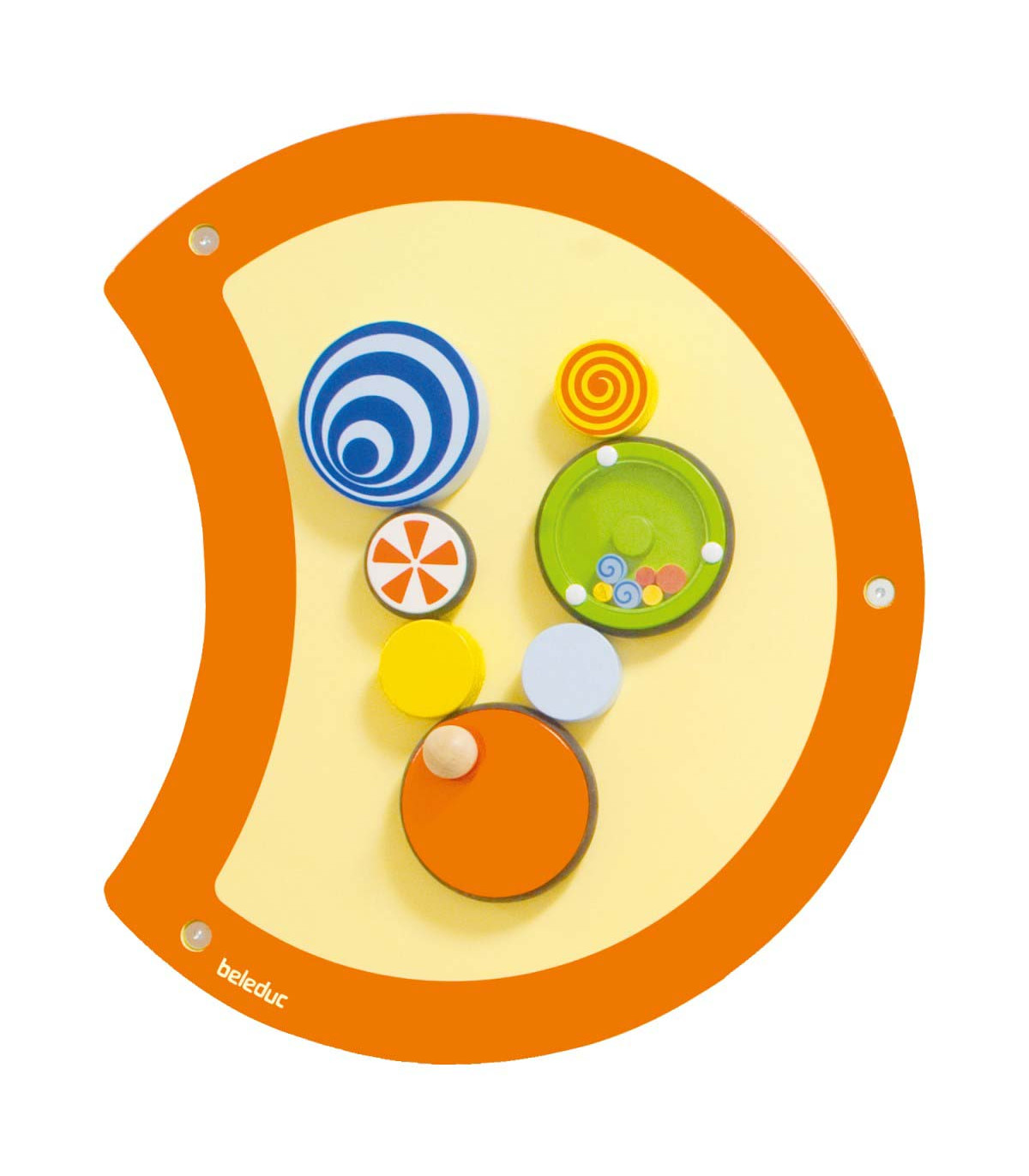 Engranajes del Juego de Pared Oruga. Al girar la rueda naranja, se giran todas las demás ruedas. Según la velocidad, se crearán efectos visuales muy llamativos. Los módulos son elementos decorativos para la pared que ofrecen muchas opciones de juego.