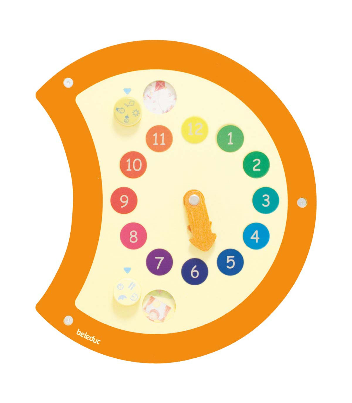 Reloj del Juego de Pared Oruga. Un acceso lúdico al concepto del tiempo. Además de las horas, ruedas muestran las 4 estaciones y los 4 momentos distintos del día. Los módulos son elementos decorativos para la pared que ofrecen muchas opciones de juego.