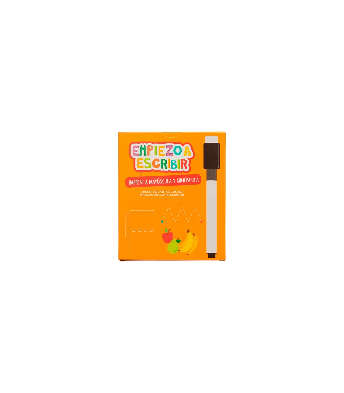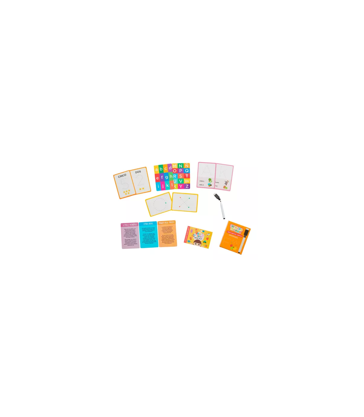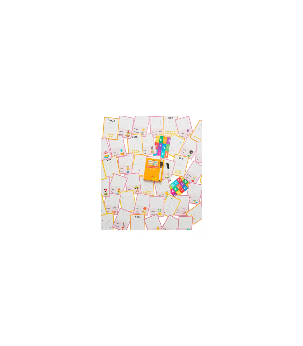 Juego de 50 cartas con grafismos, abecedario y números marcados para iniciarse en la escritura. Los niños y las niñas siguen las líneas punteadas usando el marcador y forman letras, números y formas. Contiene actividades sugeridas y marcador con borrador.
