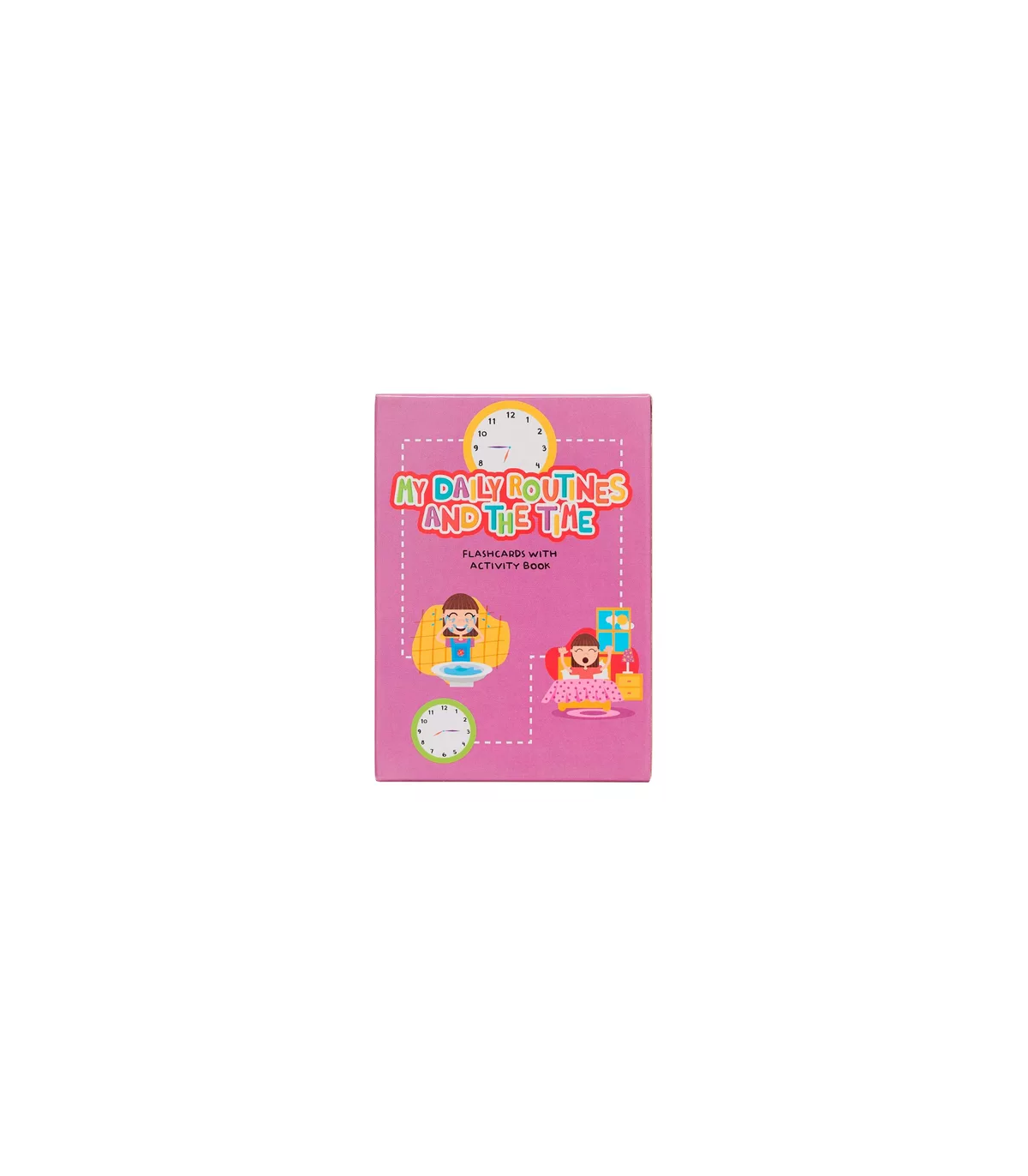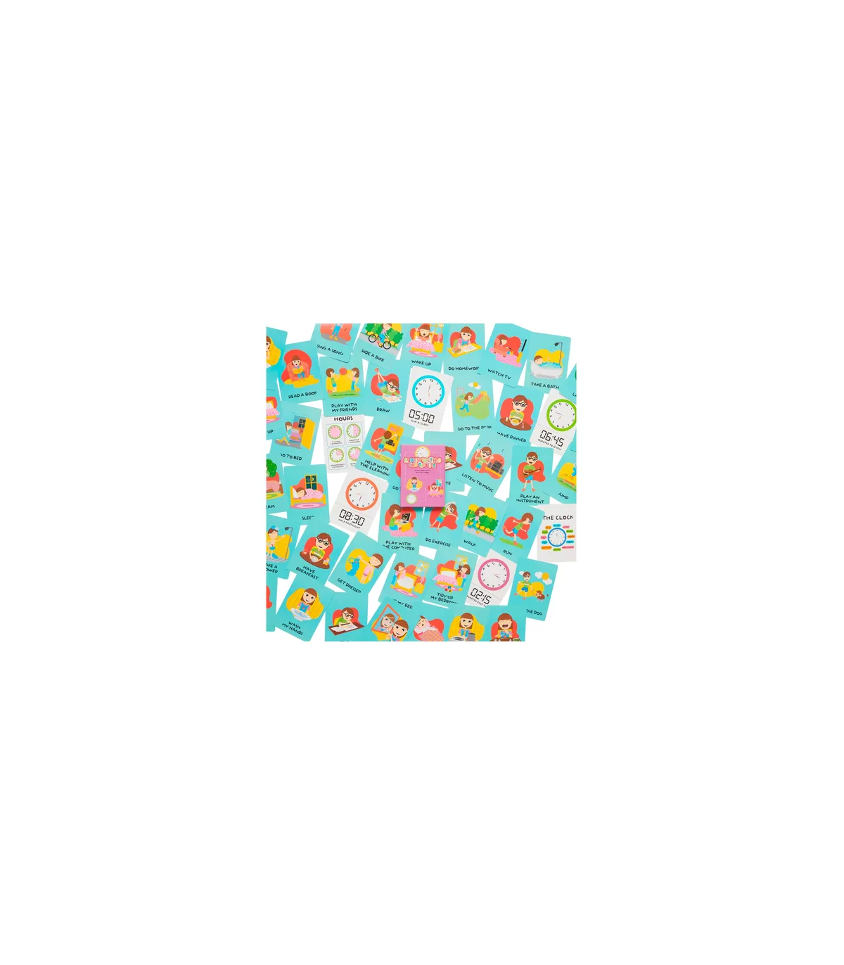 50 cartas educativas en inglés ideales para aprender y reforzar vocabulario sobre las acciones que componen nuestra rutina diaria. Los chicos y chicas aprenden también la hora y combinan las cartas con las acciones según el momento del día en que se reali