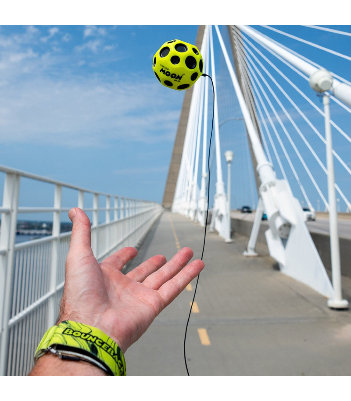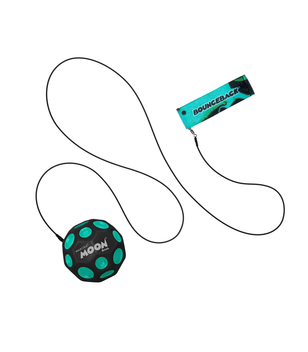 Llevá tu Moon Ball a pasear. Con Bounceback, la pelota va atada a tu muñeca con una pulsera ajustable. Tirala, hacela rebotar y atrapala en el rebote. Ideal para coordinar mano-ojo. No se desprende. Para chicos y grandes. Cuerda: 120 cm. Pelota: 6 cm.