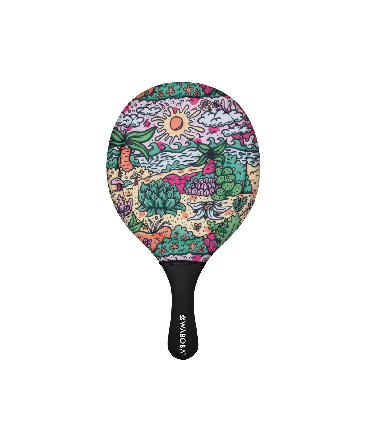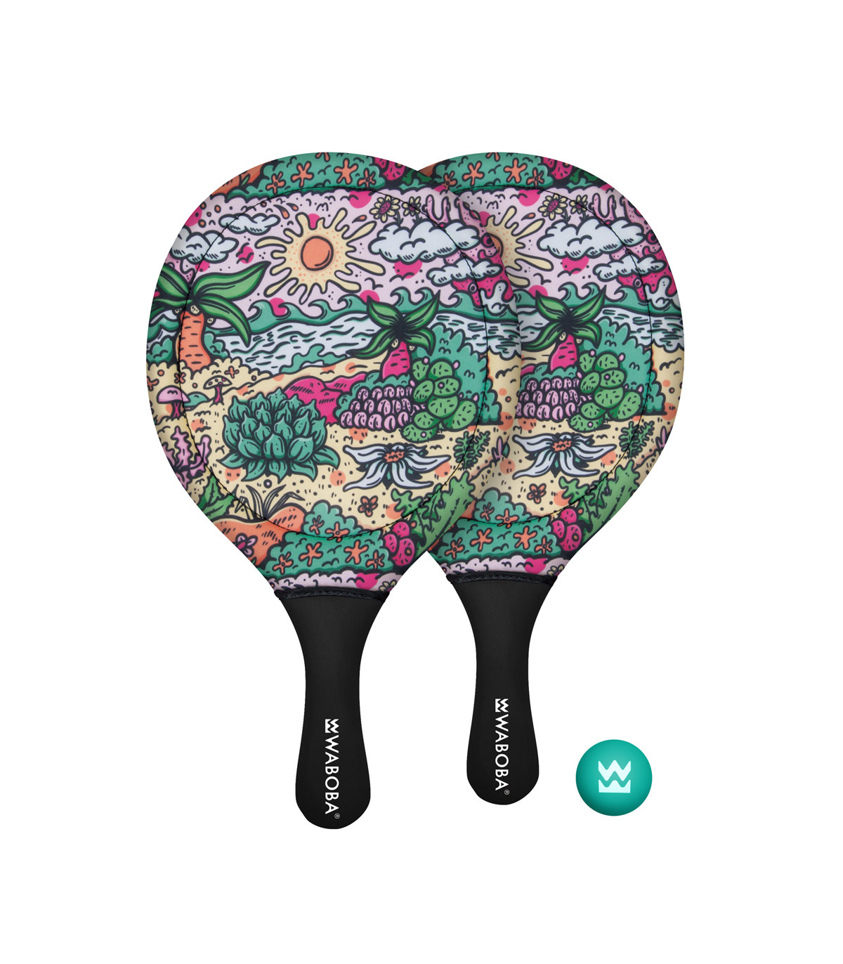 Set clásico de paletas resistentes al agua para la playa. Incluye 2 paletas con cubierta de neoprene y 1 pelota de goma que flota. Grip antideslizante, ideal para juegos en la playa o el agua. Edad: +8