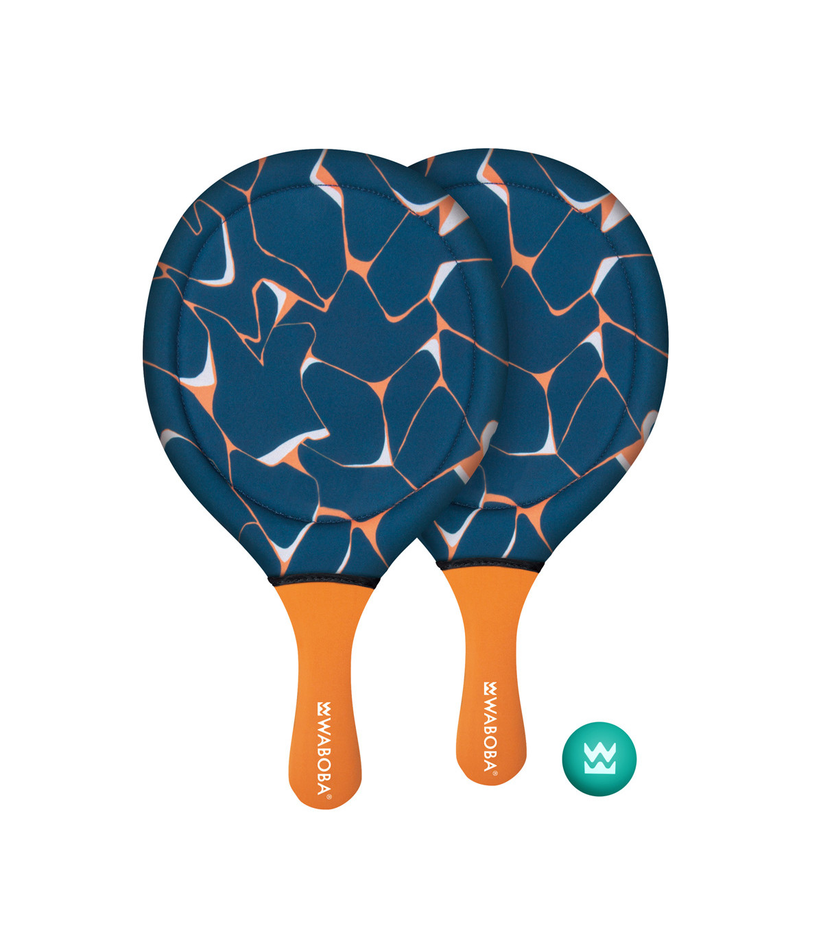 Set Sport Line de paletas resistentes al agua para la playa. Incluye 2 paletas con cubierta de neoprene y 1 pelota de goma que flota. Grip antideslizante, ideal para juegos en la playa o el agua. Edad: +8