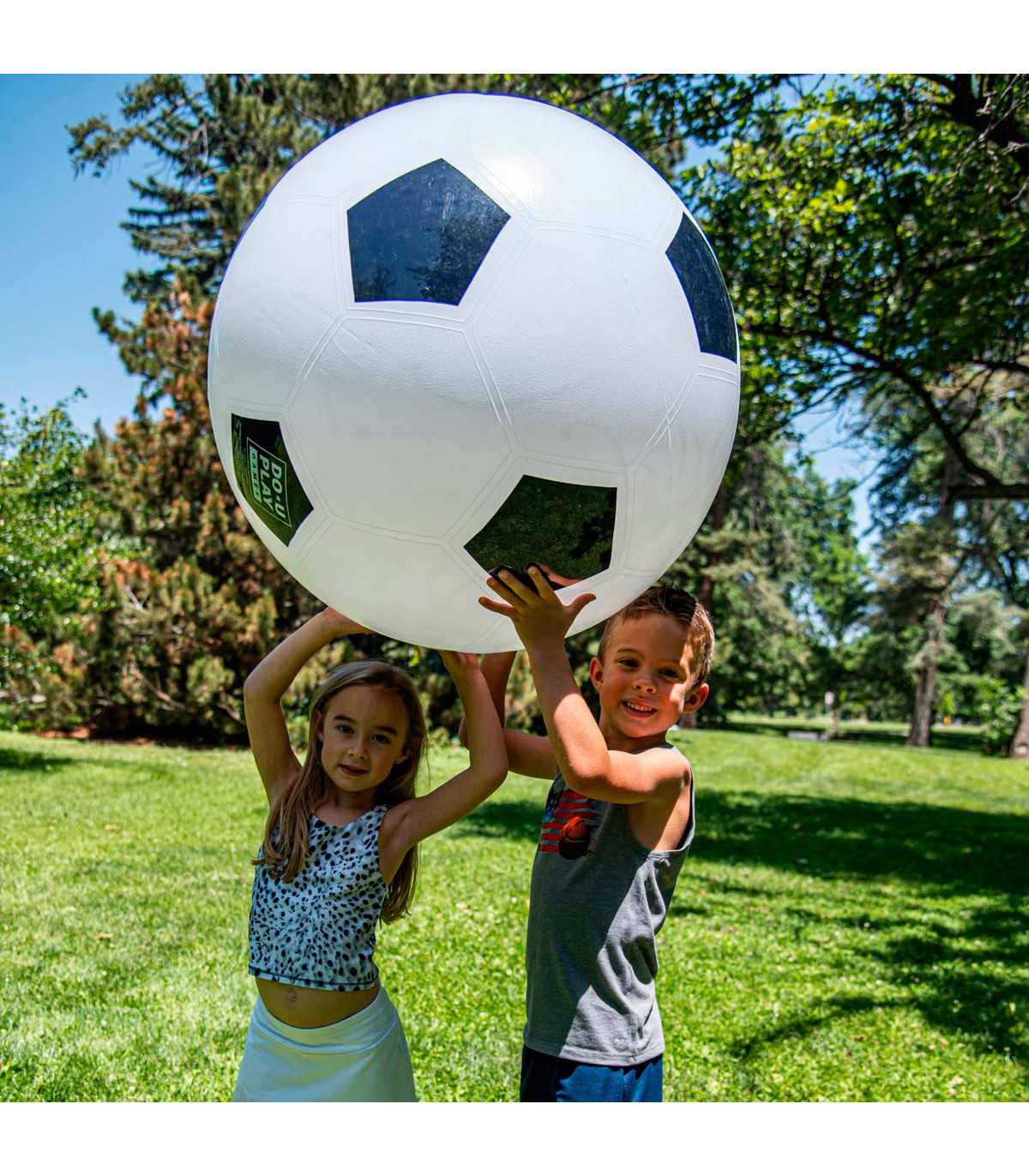 Una pelota gigante de 76 cm de diámetro de caucho resistente para que los chicos disfruten al aire libre. Ideal para quemar energía, mejorar habilidades motoras y fomentar la interacción en equipo. Incluye un inflador manual y dos tapones de plástico.