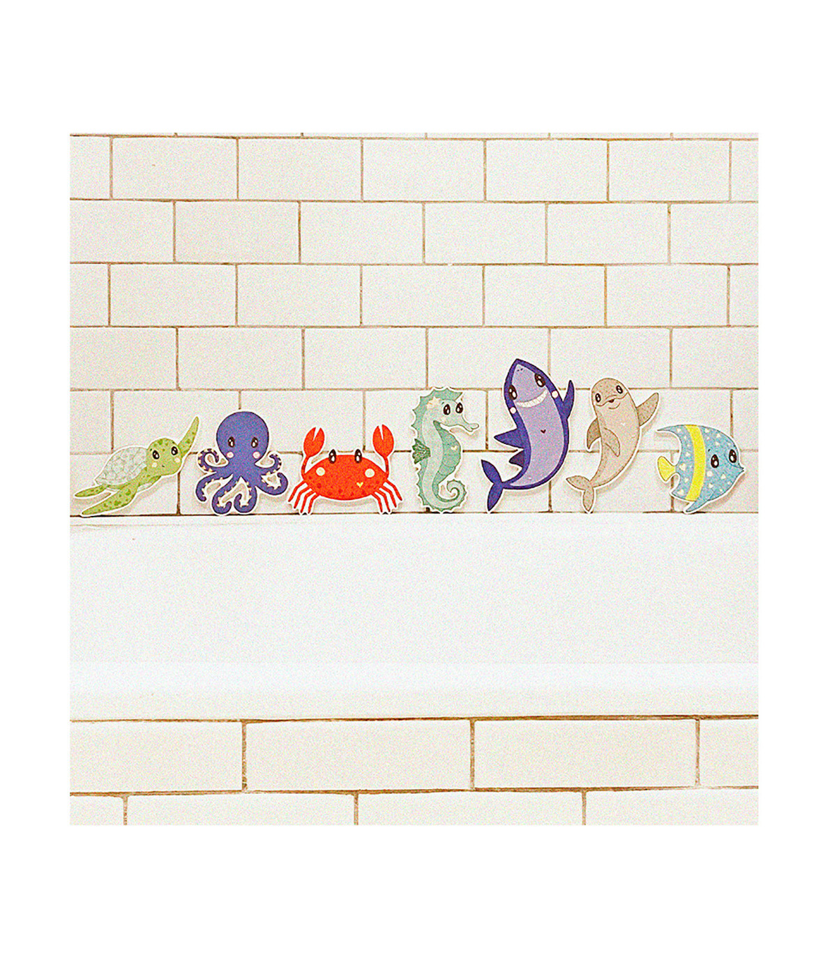 ¡La hora de bañarse nunca fue tan divertida! 7 animales de goma eva para jugar en el agua: Hipocampo, Tiburon, Pultpo, Cangrejo, Pez, Delfin y Tortuga.