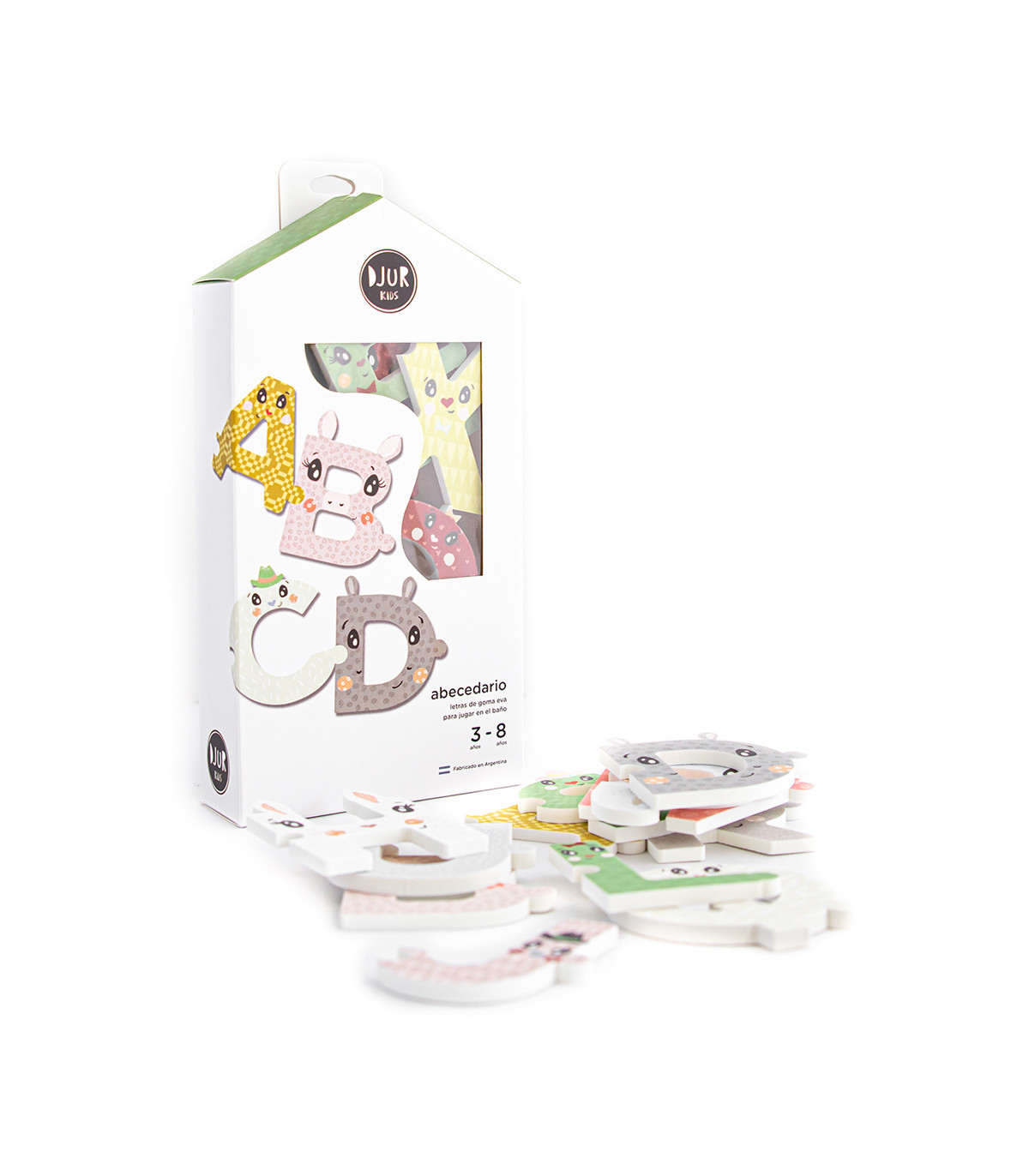 Aprendé el abecedario completo jugando con los amigos de Djur Kids. 26 letras de goma eva encastrables para fortalecer el primer contacto con las palabras