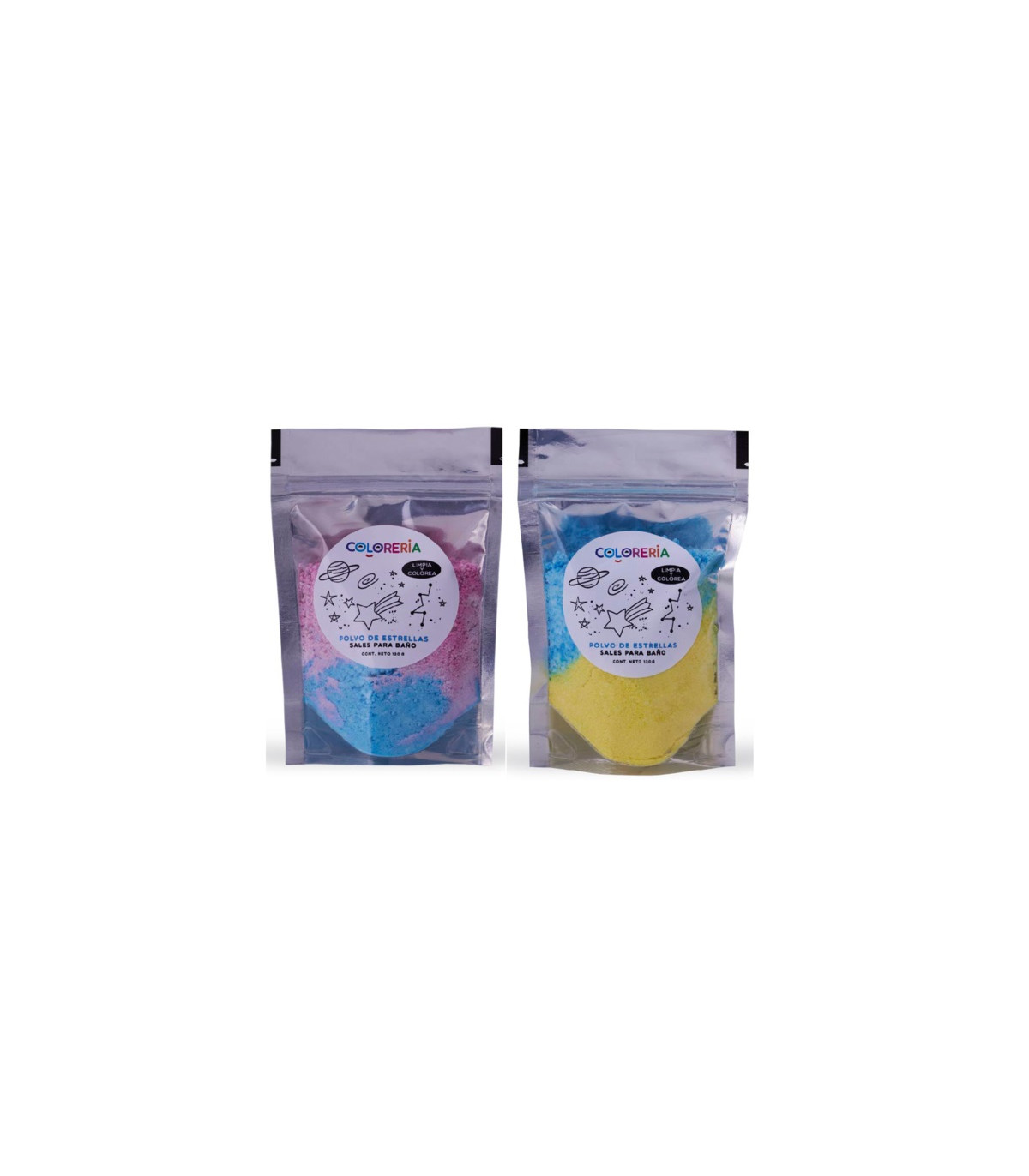 Polvo de sales efervescentes para la bañadera. Limpia el cuerpo y colorea el agua. Aprobado por Anmat para uso en niños a partir de 3 años. Deja un perfume rico y suave. Vegano y cruelty free. Color celeste y amarillo, y celeste y rosa.