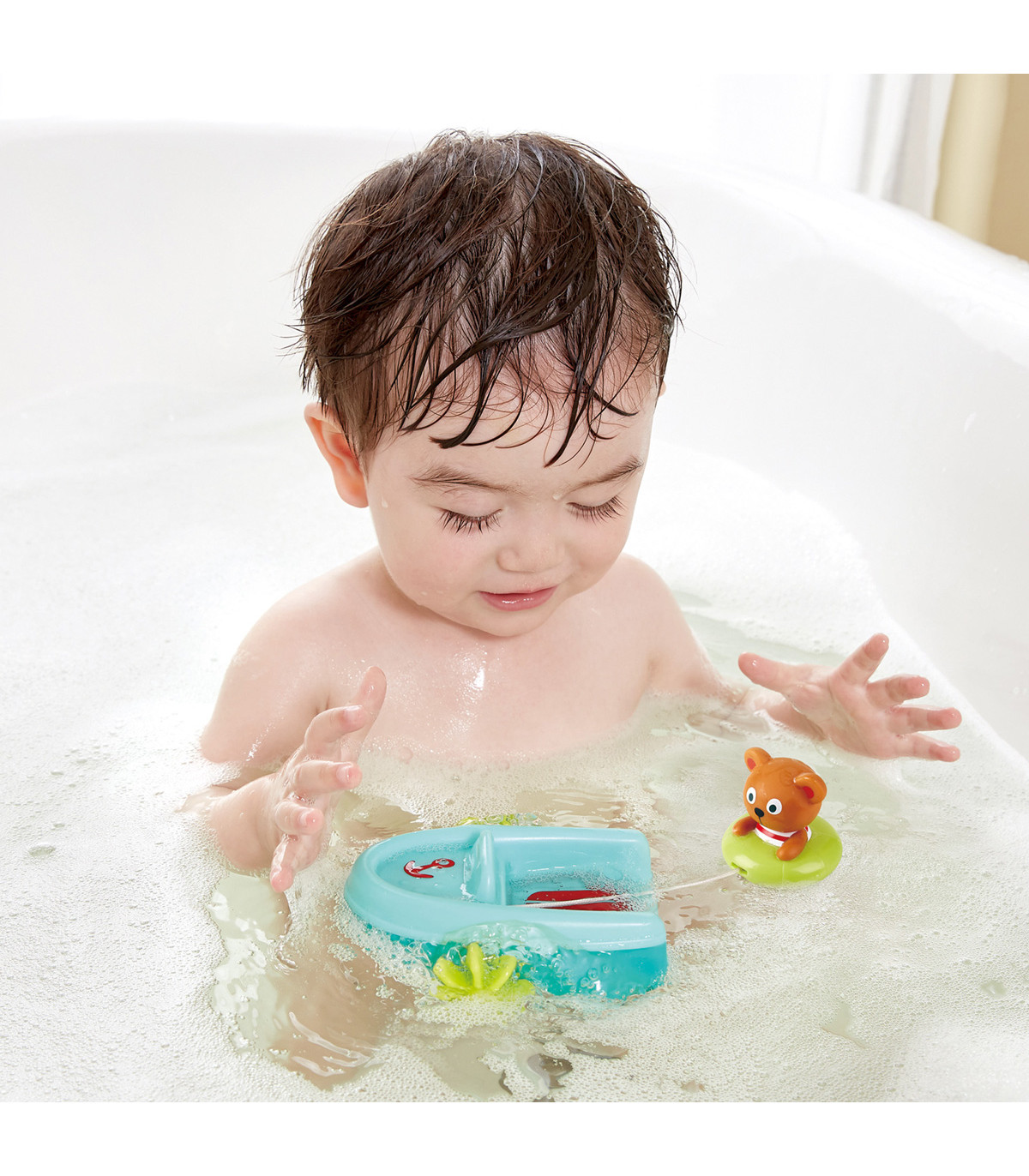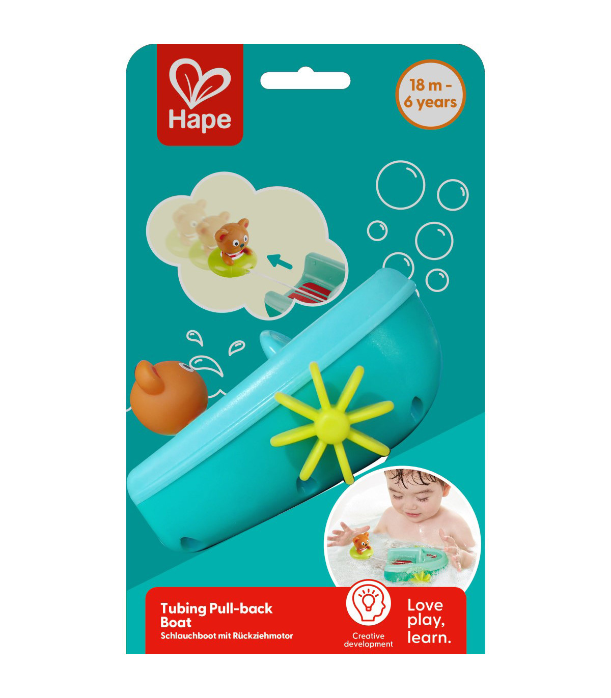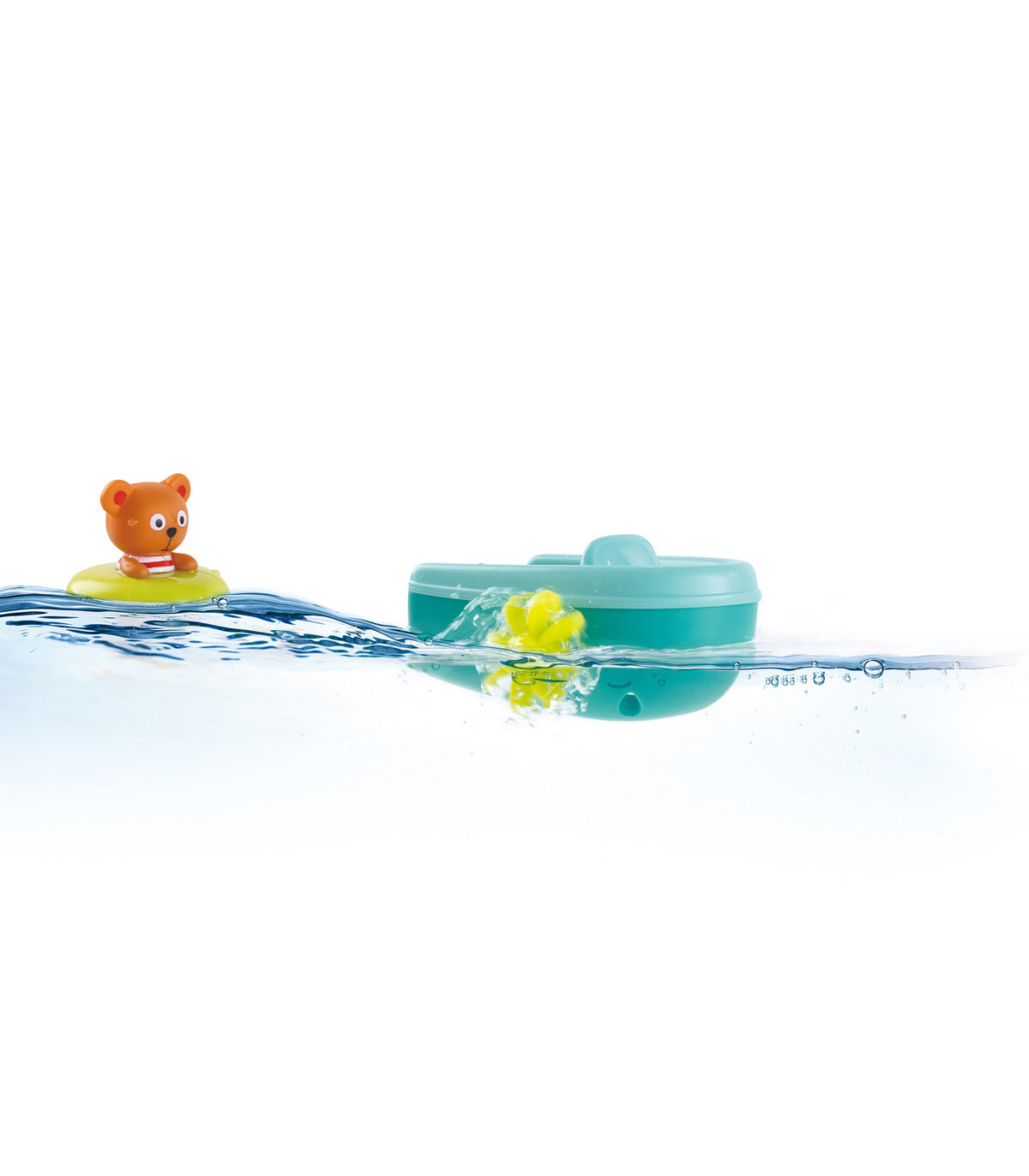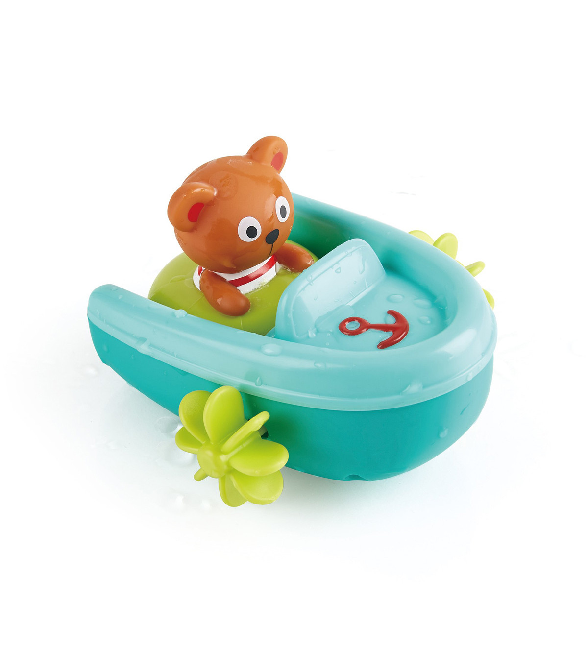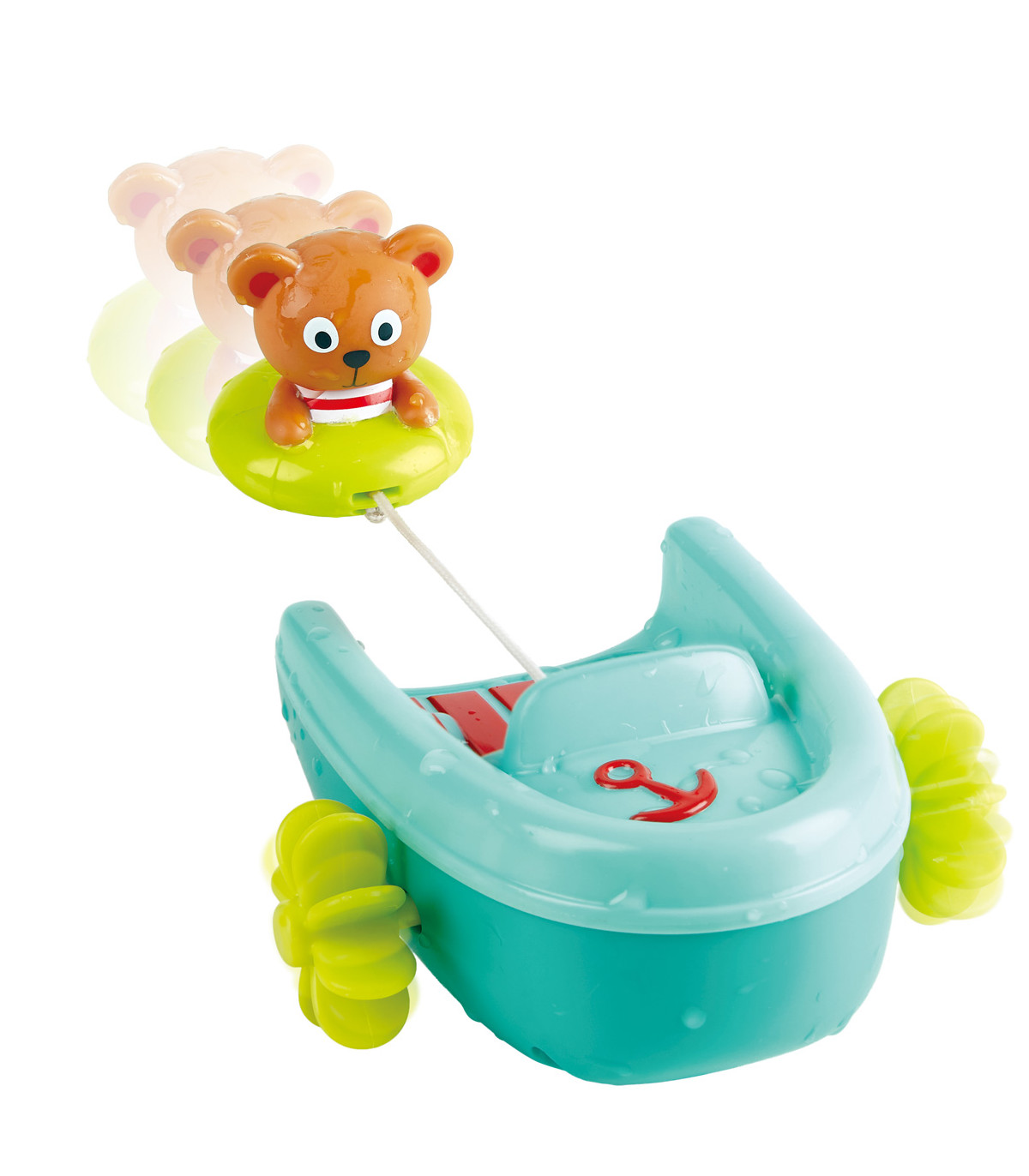 Este barco de juguete de baño tira hacia atrás a su capitán, el oso, y el barco rema hasta que el oso llegue al barco nuevamente. Ideal para desarrollar la coordinación mano-ojo en chicos mayores de 18 meses.