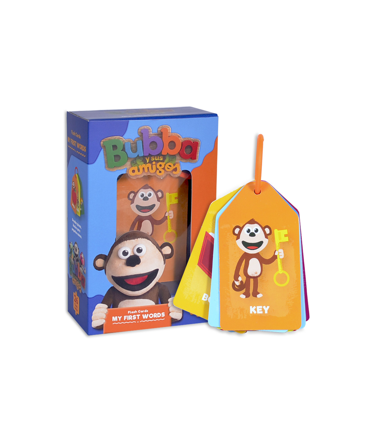 26 flashcards de cartón unidas por un anillo plástico, ideales para que los niños en edad preescolar empiecen a familiarizarse con las palabras a través del juego.