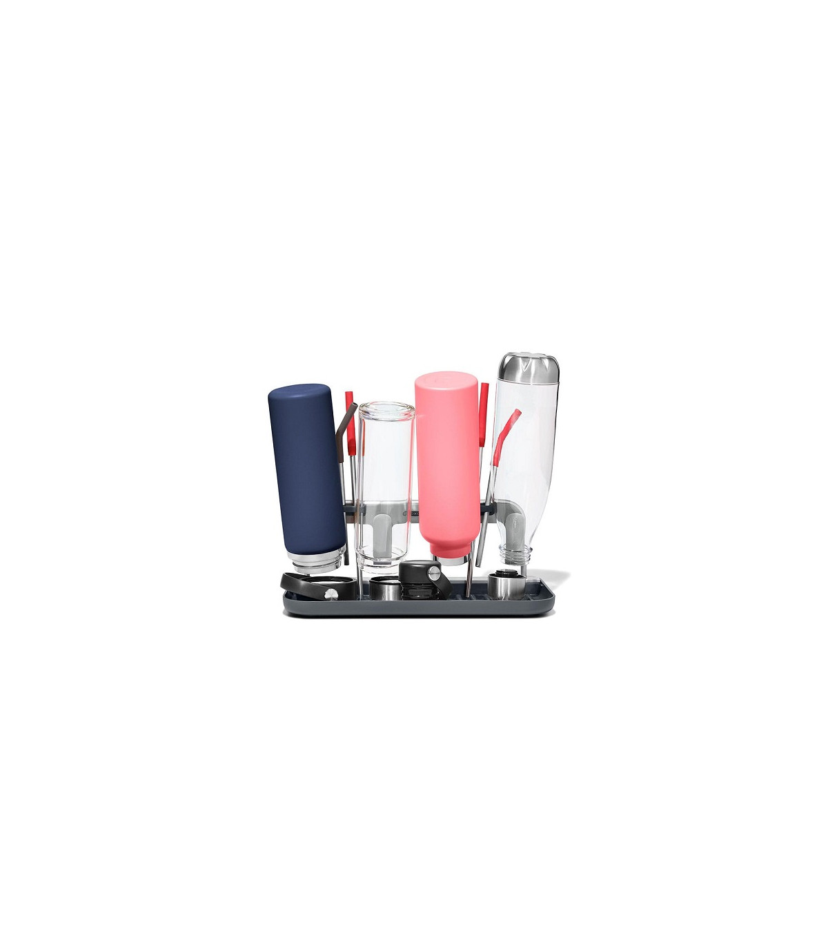 El diseño innovador del Rack tiene capacidad para cuatro botellas de agua y cuatro tapas, y los exclusivos soportes para popotes mantienen elevados hasta cuatro popotes reutilizables para un secado higiénico y eficiente. Los bordes elevados del estante ev
