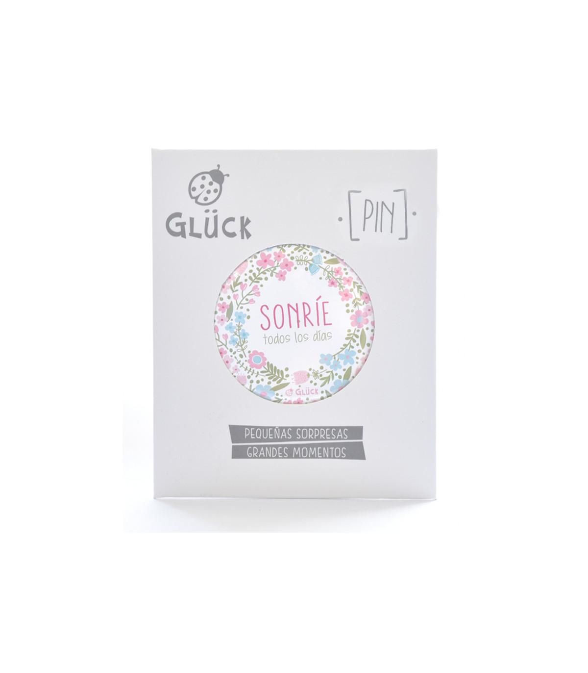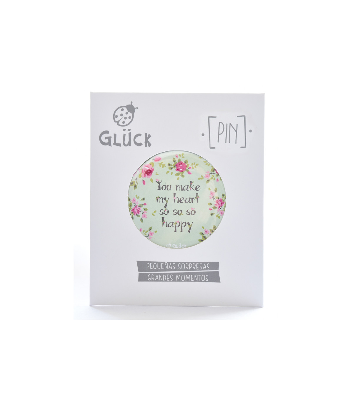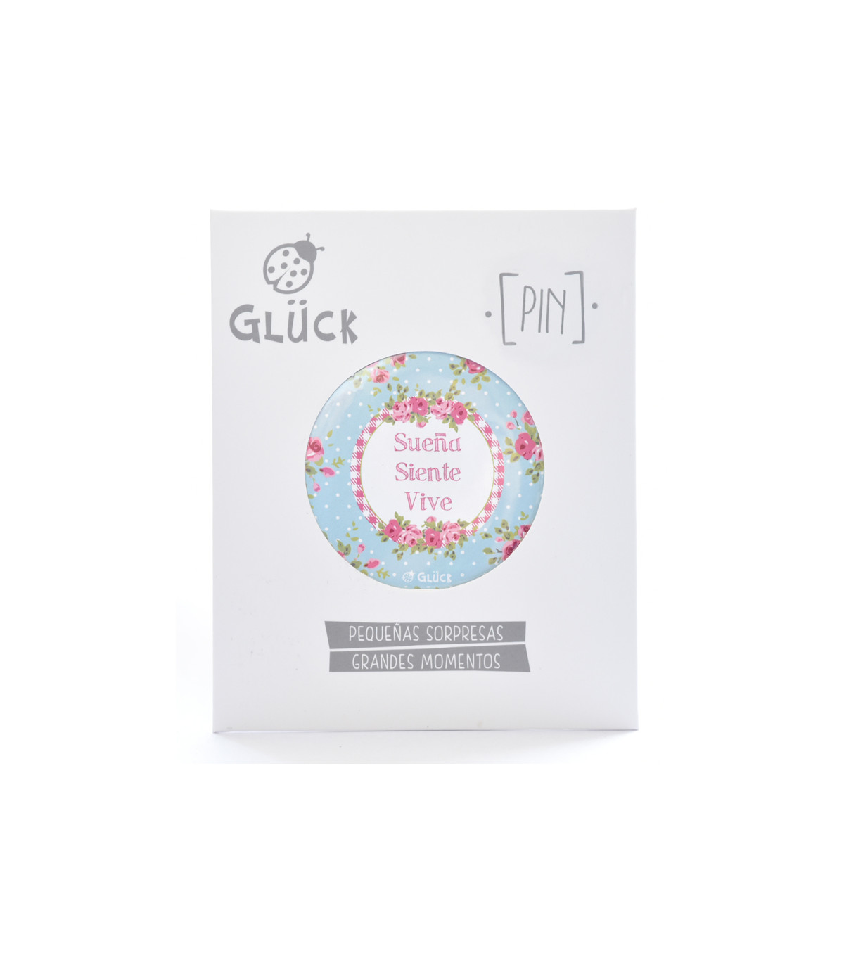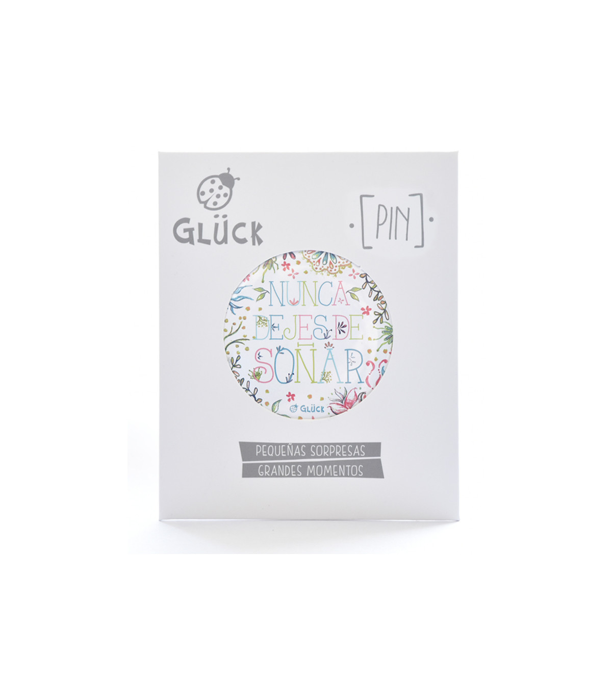 Un pin metálico con alfiler de gancho en caja con espacio para dedicatoria. Motivos de la colección Mensajes para el Alma.