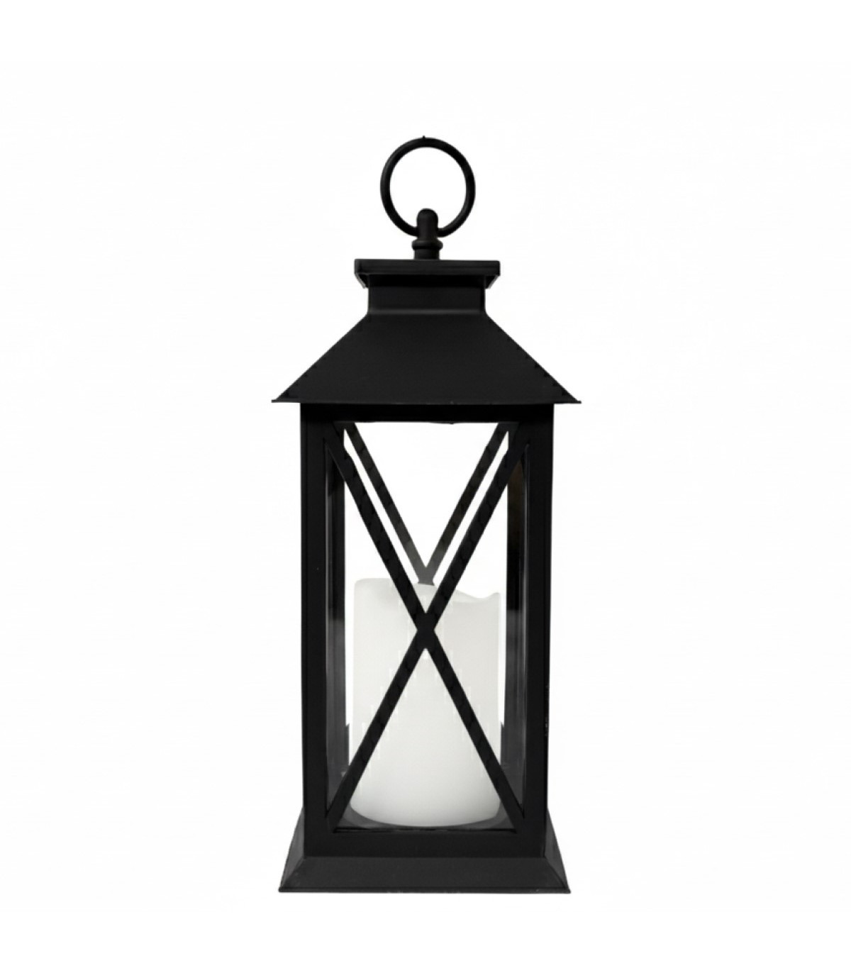 Un farol plástico símil hierro de 30 cm de alto con una vela de luz LED blanca cálida de 7.5 cm de diámetro y 10 cm de alto. La llama titila dándole un efecto muy realista. Usa 3 pilas AAA no incluidas. Incluye switch ON-OFF.