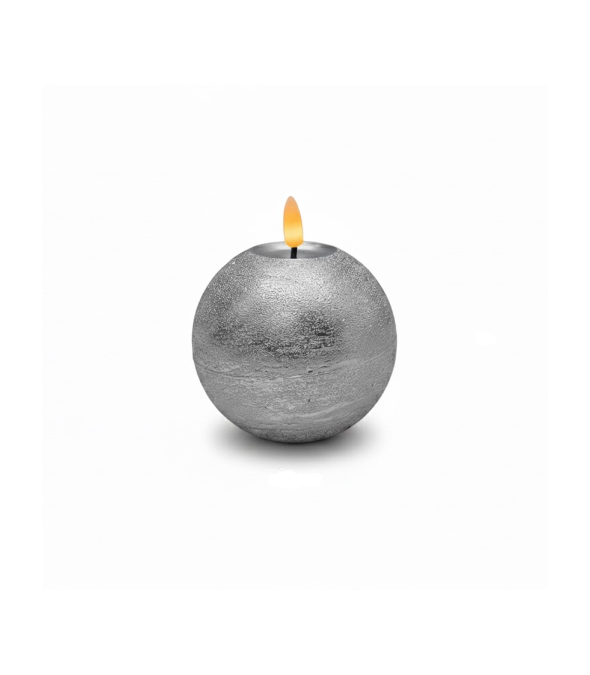 Una vela esférica de luz LED blanca cálida de 8 cm de diámetro, con función Touch Top que se prende y apaga al tocar con dos dedos la parte superior de la vela. La llama titila con un efecto realista. Usa 2 pilas AA no incluidas. Con switch ON-OFF.