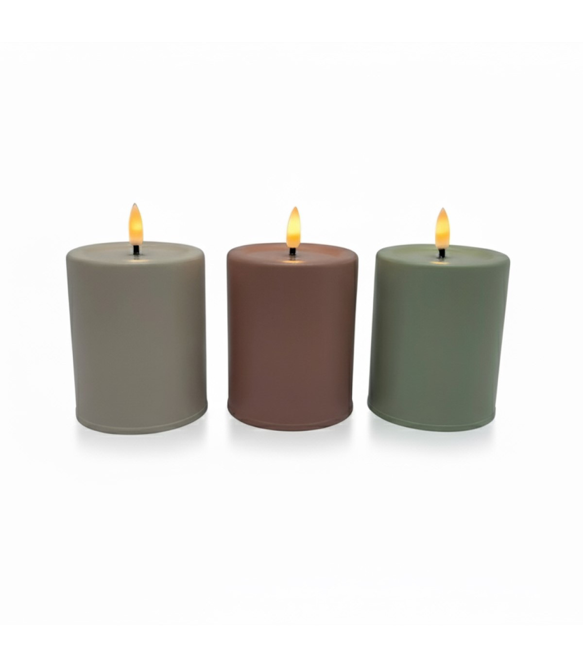 Una vela pilar de luz LED blanca cálida de 7.9 cm de diámetro y 10 cm de alto con efecto derretido. La llama titila con efecto realista. Usa 2 pilas AA no incluidas. Con switch on-off.