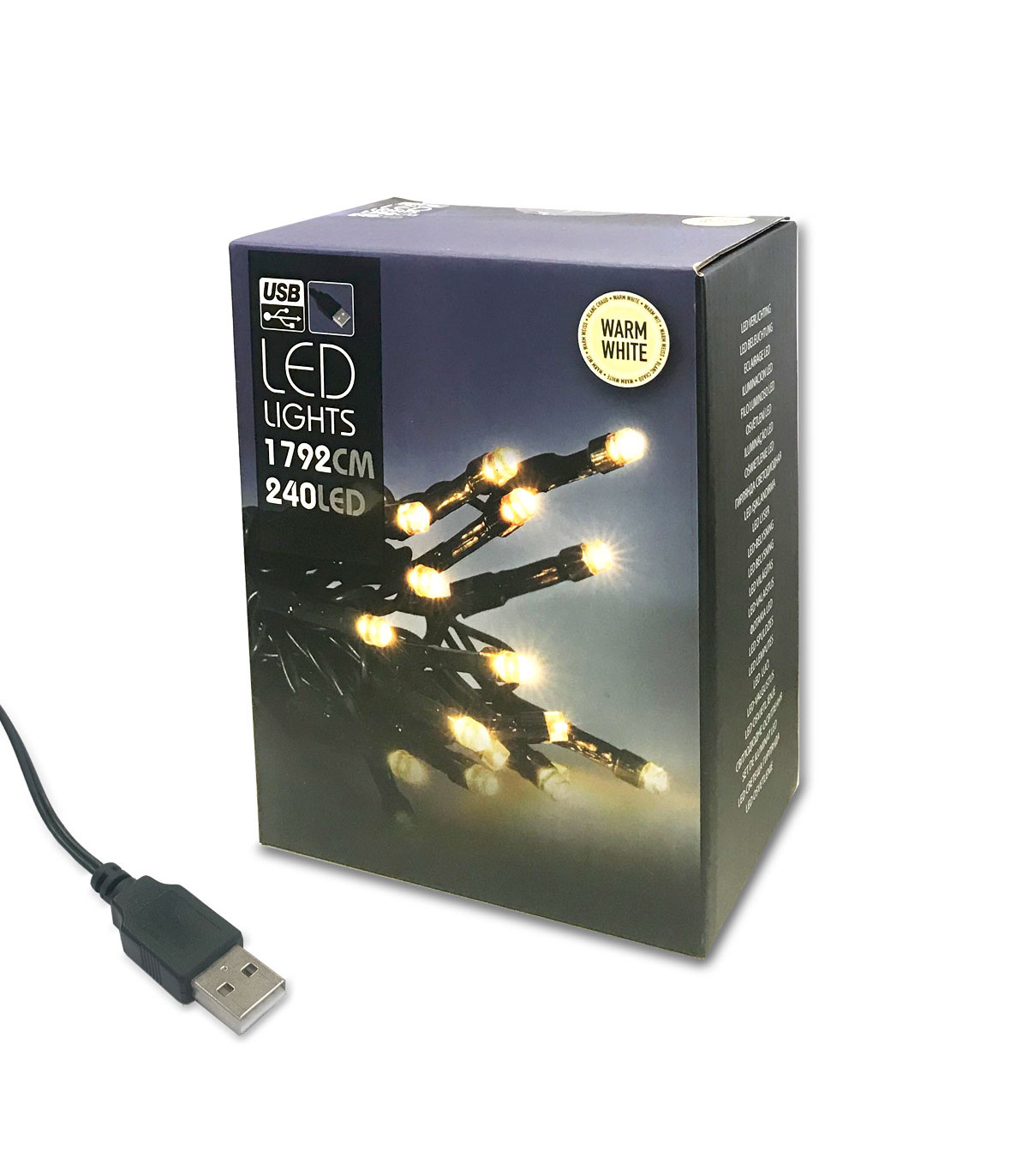Una girnalda de 240 luces LED cálidas 17,92 m de largo. Funciona con conector USB. Cable verde.