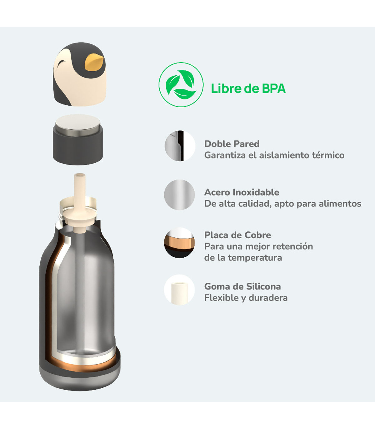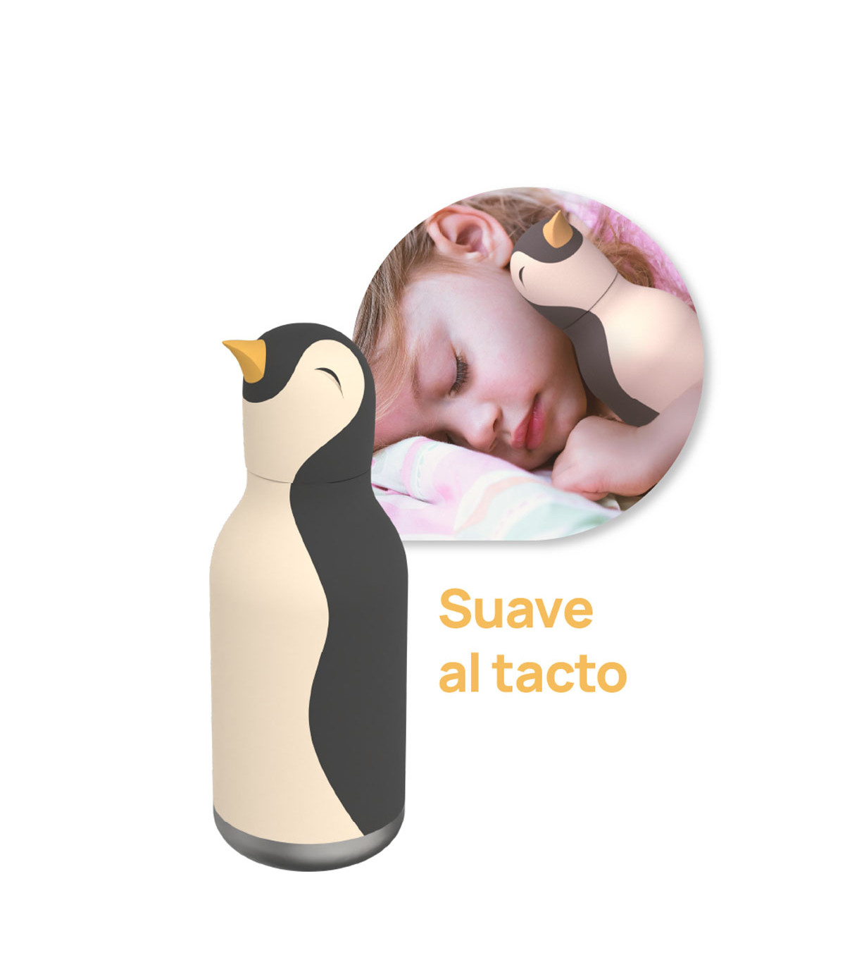 Una botella de 460 ml con doble capa de acero inoxidable y diseño de un gracioso pingüino en la tapa. Hay diferentes opciones para elegir. Ideal para los más chicos, con cierre hermético a prueba de derrames. Incluye sorbete reutilizable.