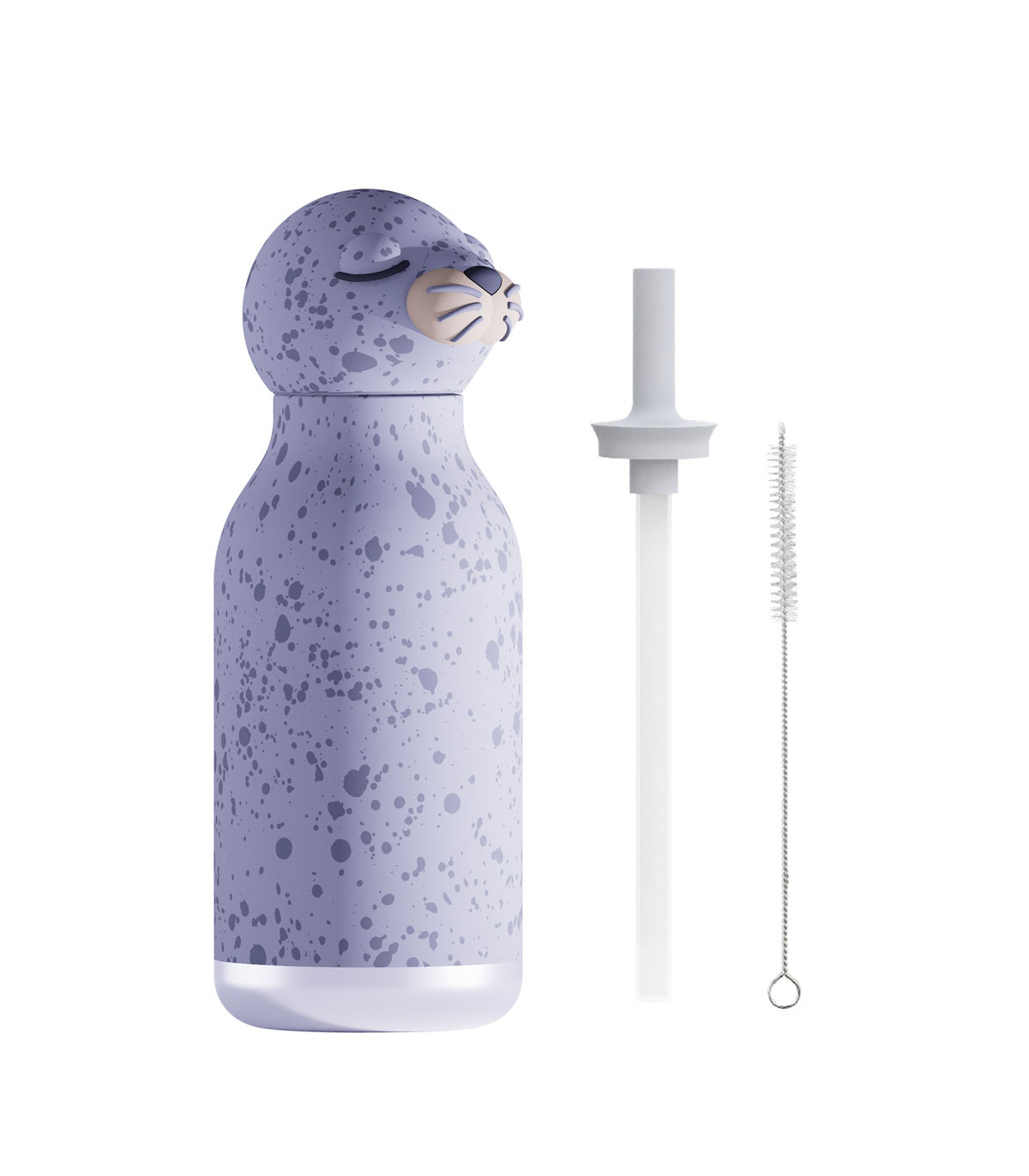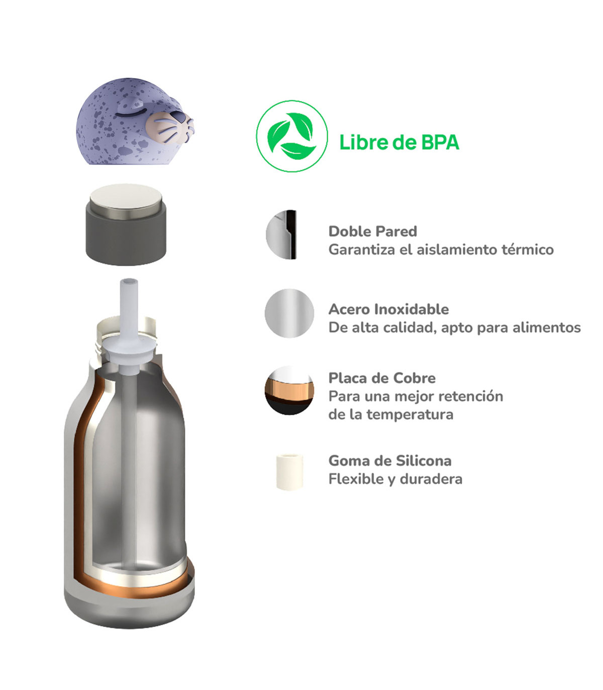 Una botella de 460 ml con doble capa de acero inoxidable y diseño de una linda foca en la tapa. Hay diferentes opciones para elegir. Ideal para los más chicos, con cierre hermético a prueba de derrames. Incluye sorbete reutilizable.
