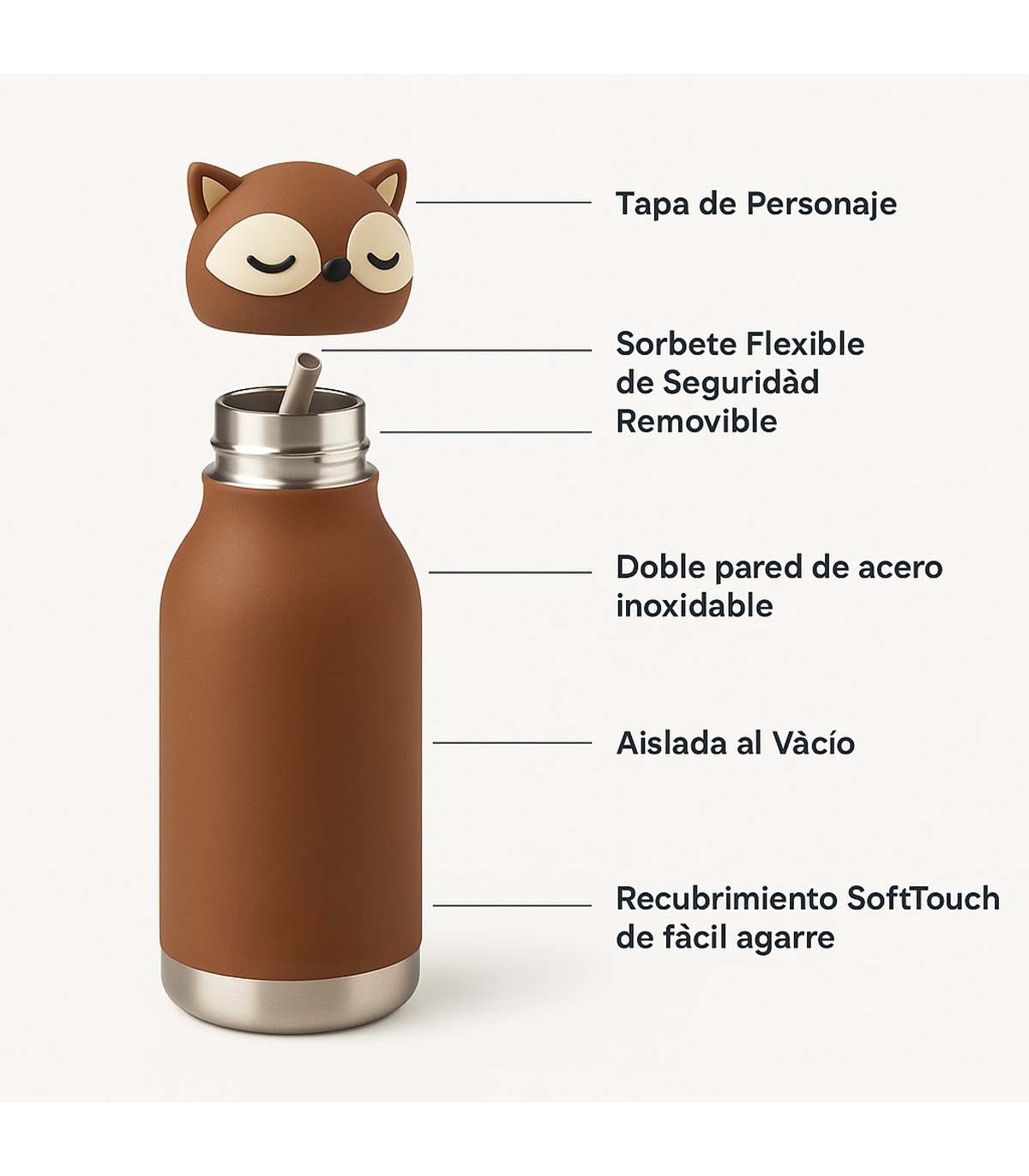 Una botella de 460 ml con doble capa de acero inoxidable y diseño de un amigable zorro en la tapa. Hay diferentes opciones para elegir. Ideal para los más chicos, con cierre hermético a prueba de derrames. Incluye sorbete reutilizable.