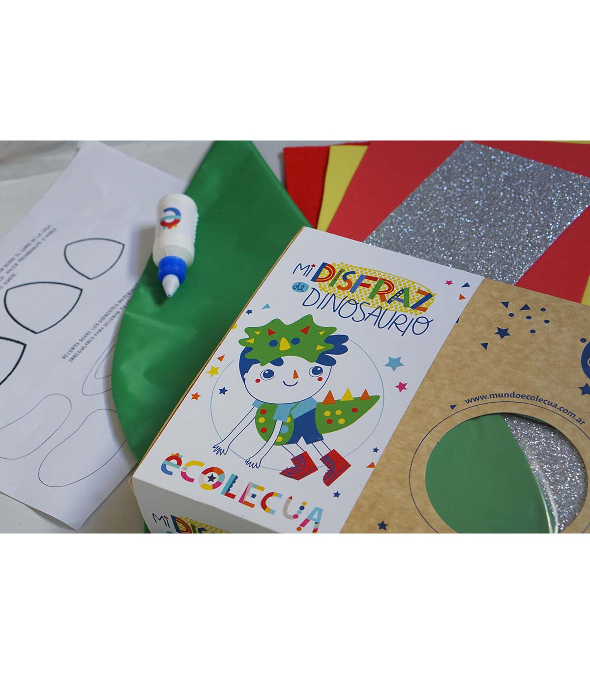 Kit para crear tu propio disfraz de dinosaurio - contiene todo lo necesario para crear y decorar una mascara, una pechera y una cola de dino.