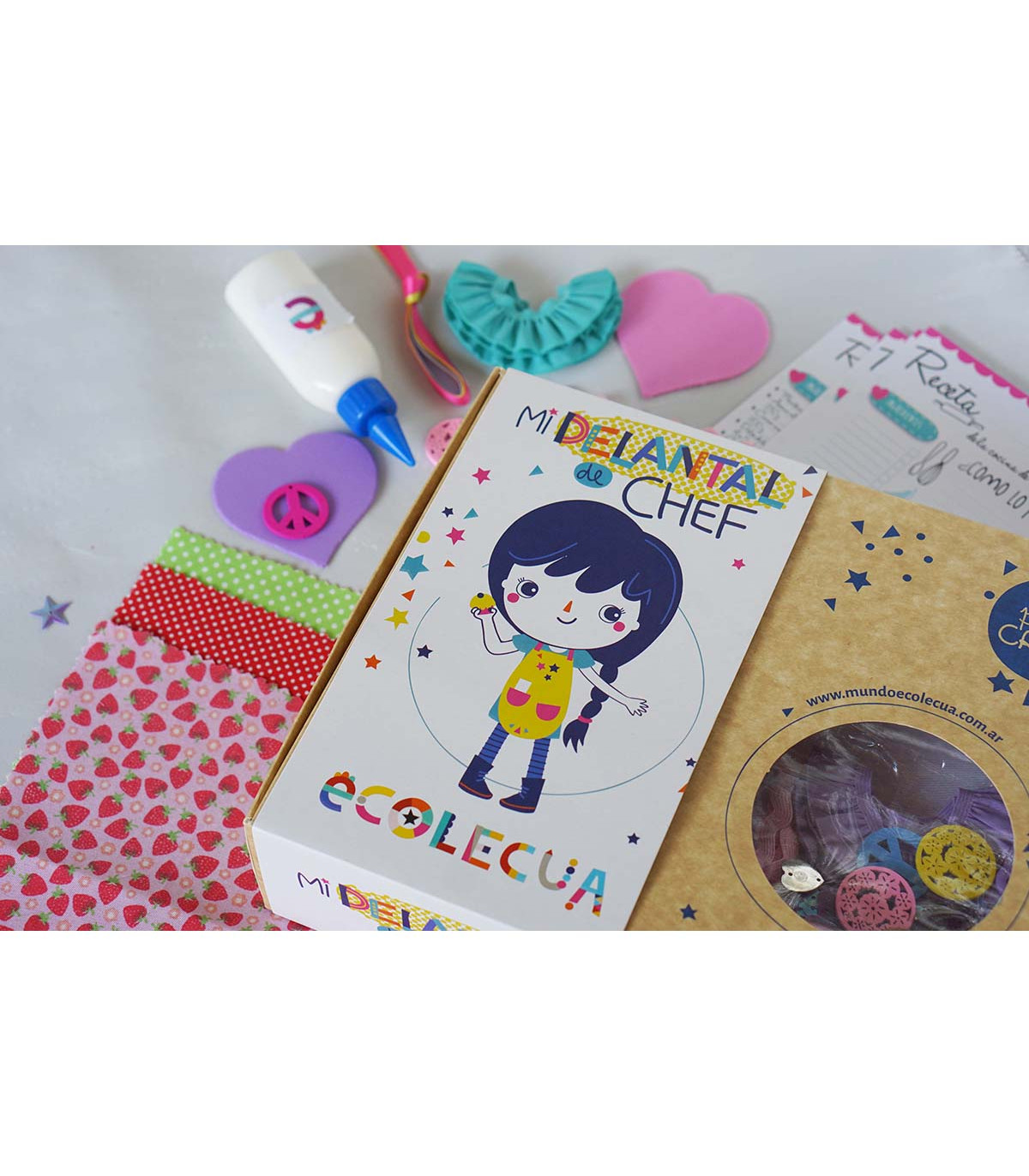 Kit para diseñar y decorar tu propio delantal - contiene delantal de tela, telas de colores, cintas, lanas y pegamento.