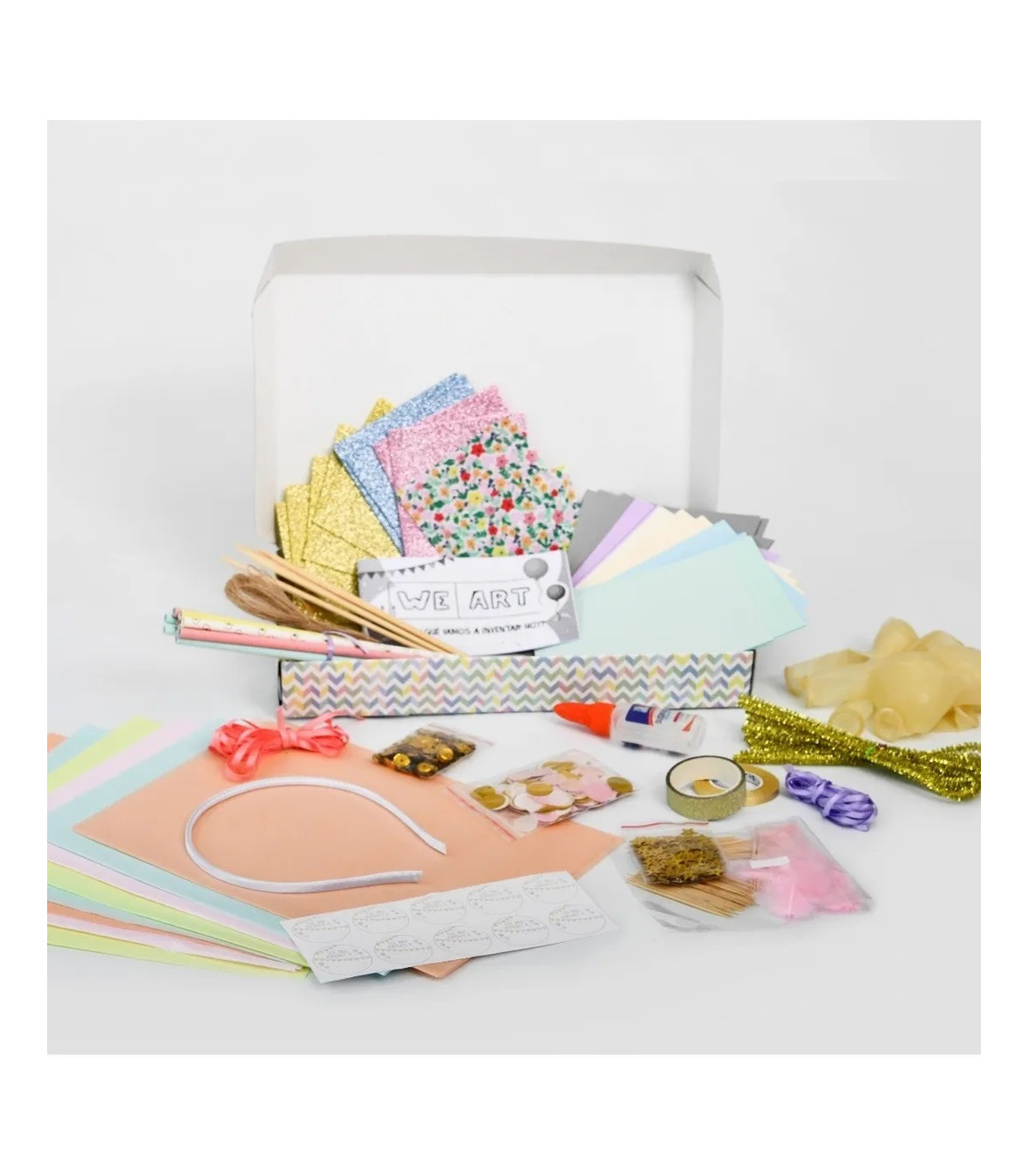 Caja de Manualidades We Art DECO, con todo lo que necesitas para hacer tus propias decoraciones para tu FESTEJO!! Viene un librito para poder armar tu vincha de cumple, sorbetes, etiqueta, guirnaldas, banderines Deco torta, Toppers de corazones, banderine