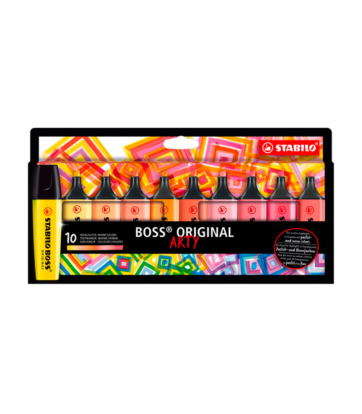Una caja con 10 resaltadores de colores cálidos Boss Arty de Stabilo. Ancho de trazo 2-5 mm y tinta con base de agua.
