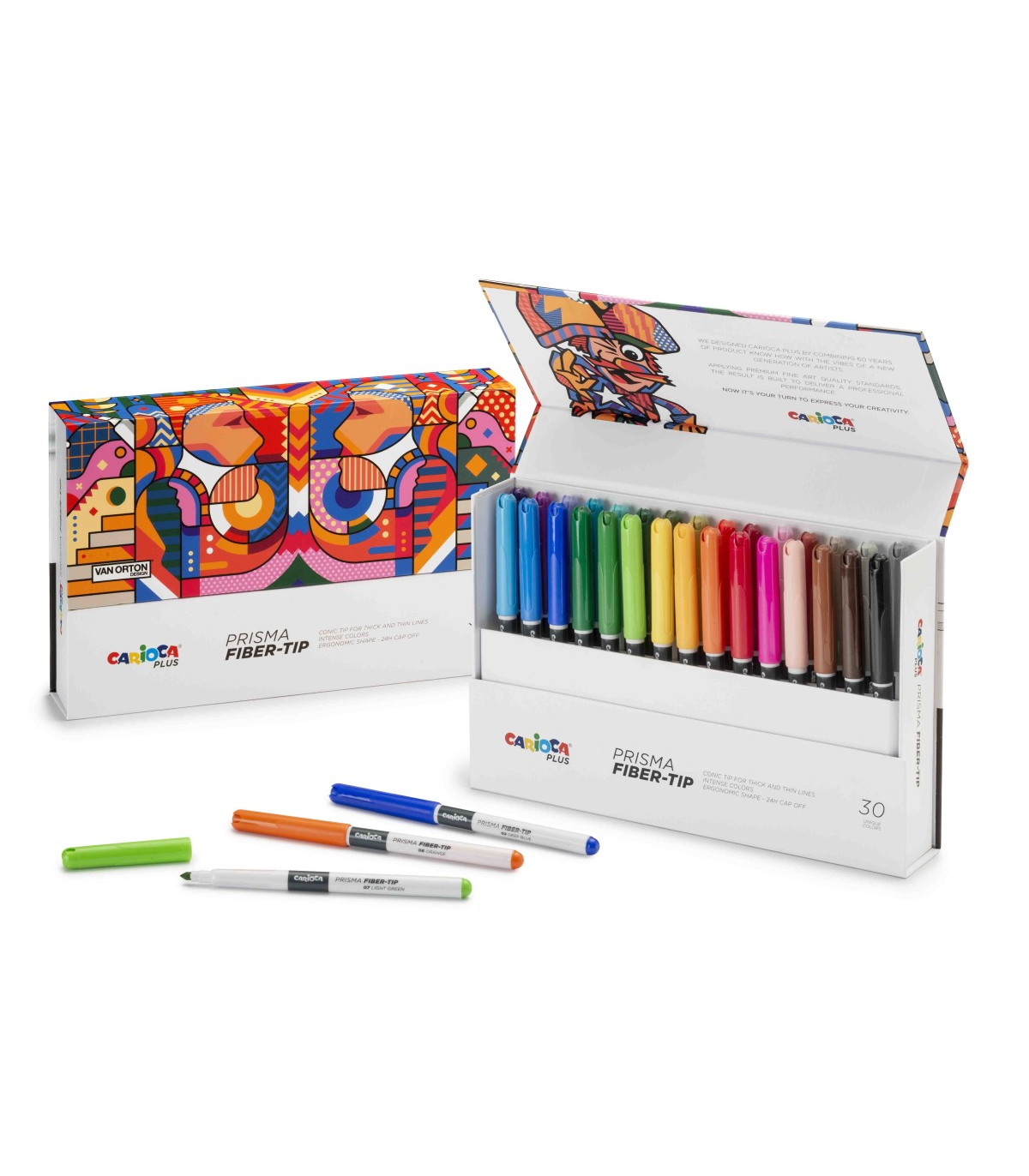 Una caja rígida con 30 marcadores de colores de punta de fibra de calidad superior. La punta cónica permite un trazo doble, fino y grueso, en un solo marcador. Tinta súper intensa y resistente a la luz.