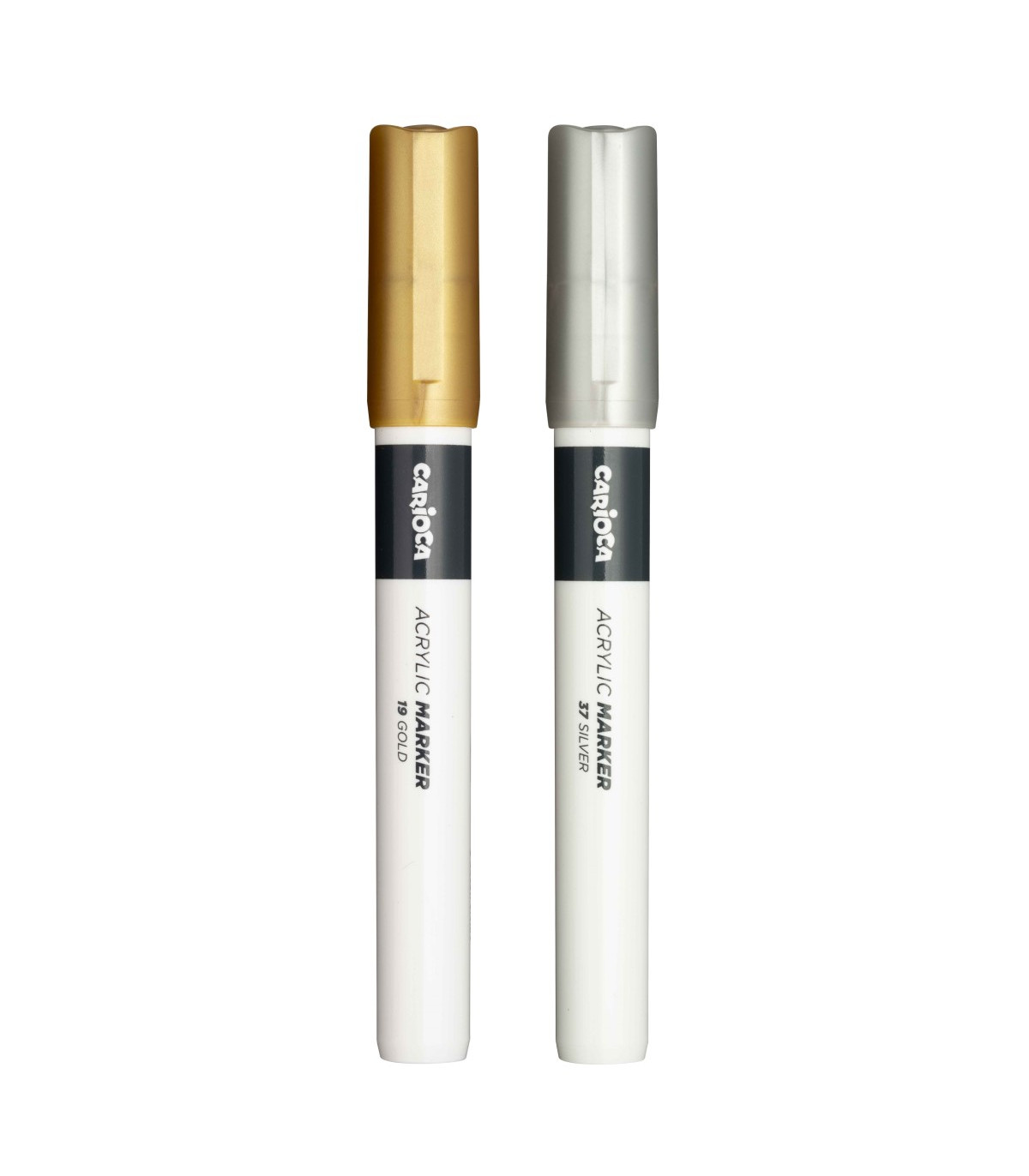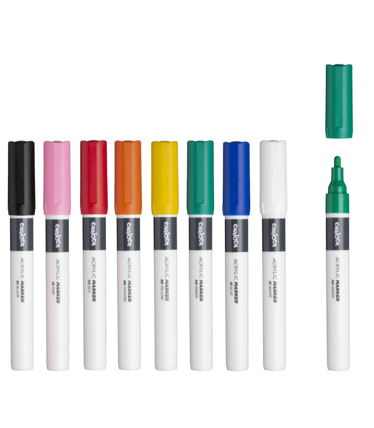 Una caja rígida con 8 marcadores acrílicos de tinta acrílica súper pigmentada. Escribe sobre todas las superficies. Punta de 2 mm que se activa fácilmente y no se seca al aire. Colores resistentes a la luz.