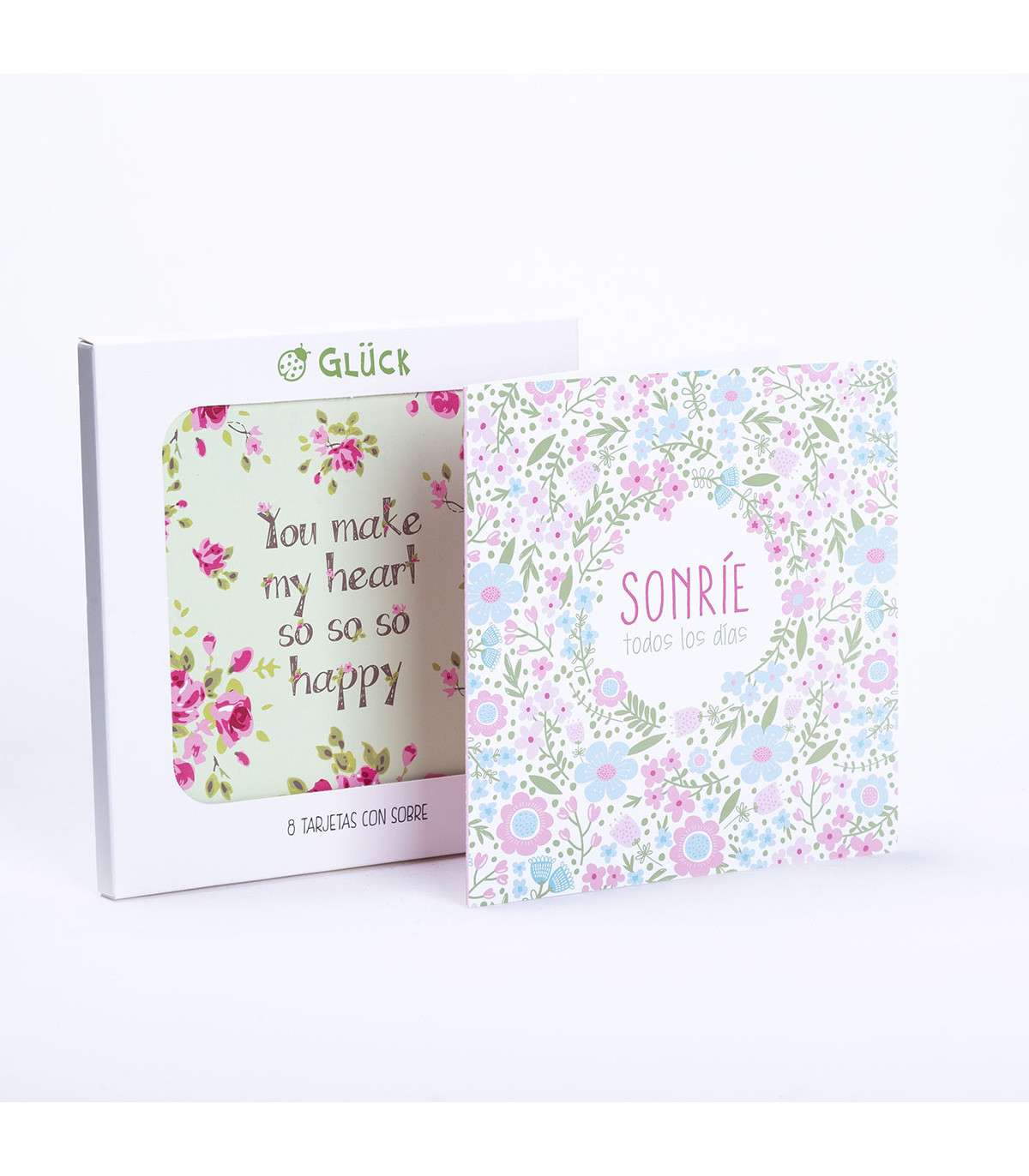 8 tarjetas tipo libro de papel ilustración con sobre con tapa y contratapa impresas a 4 colores. 4 con diseño de You make my heart so happy y 4 con diseño de Sonríe todos los días. Colección: Mensajes para el alma.