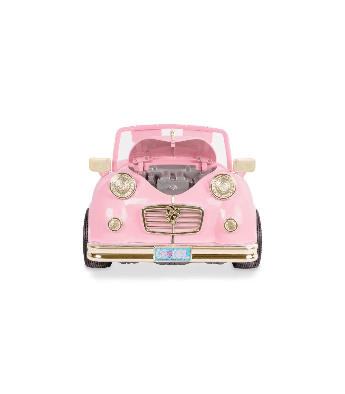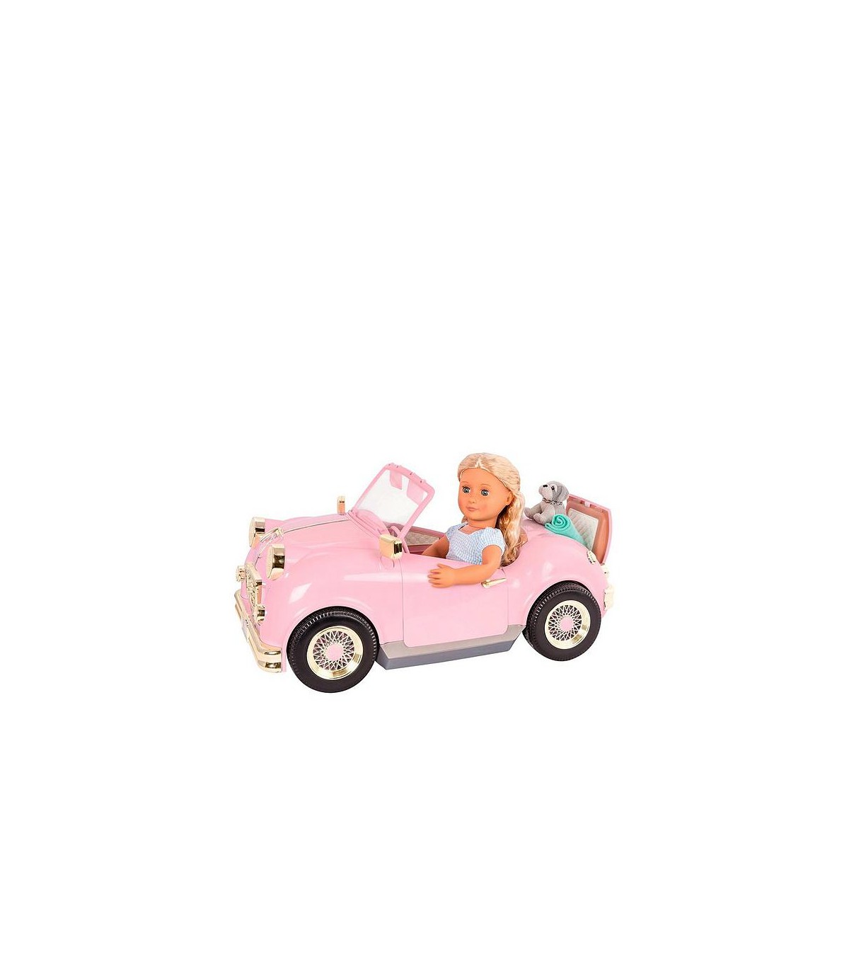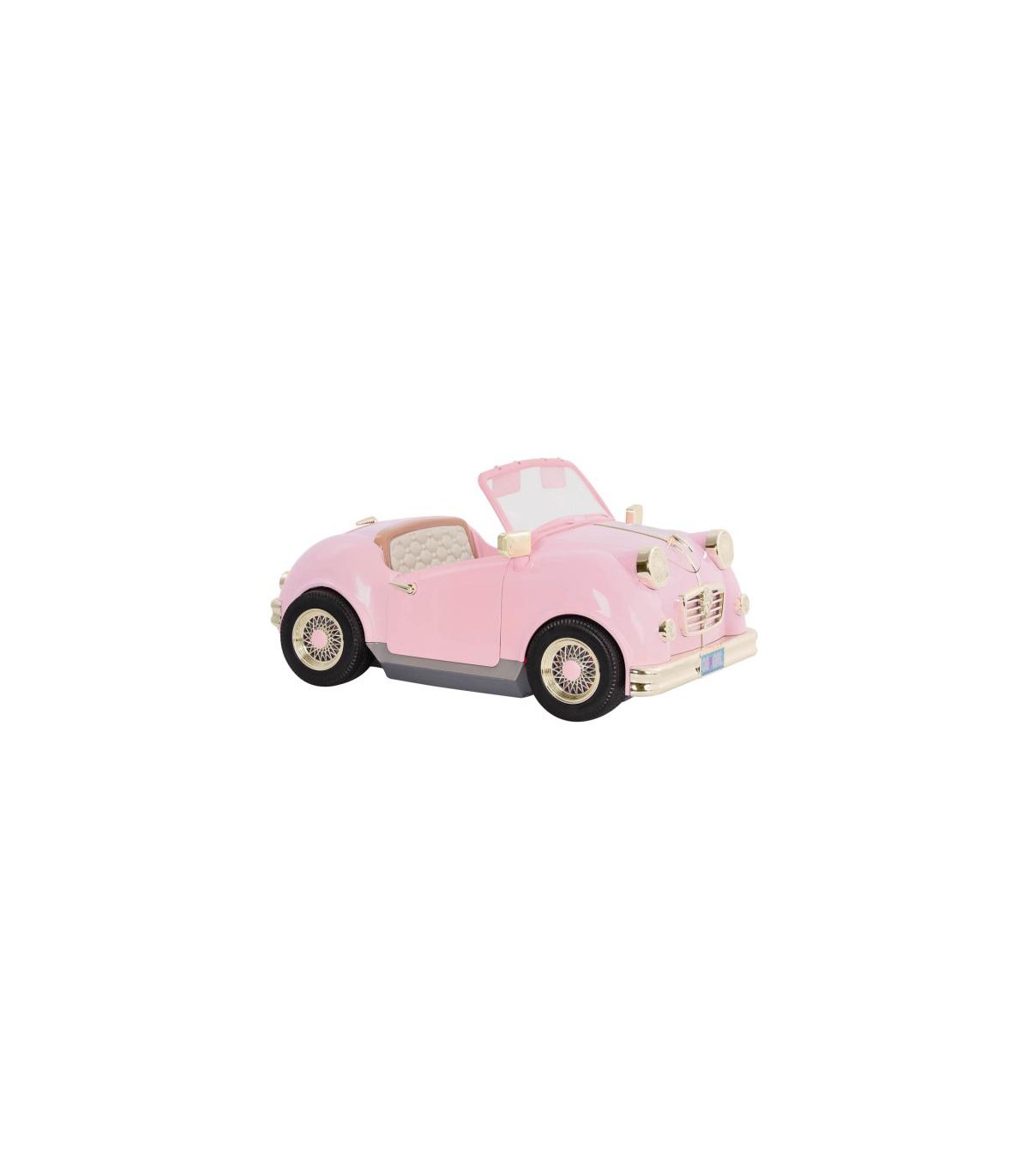 Dos de tus muñecas favoritas de 46 cm pueden viajar cómodamente en este divertido convertible rosa para muñecas. ¡Usa el asiento rebatible en la parte de atrás para guardar el equipaje de tu muñeca, una canasta de picnic o incluso su mascota cuando la lleves a dar un paseo! Escucha tus canciones favoritas con la radio FM con funcionamiento real o elige una de las 4 canciones grabadas como la banda sonora de tu viaje.