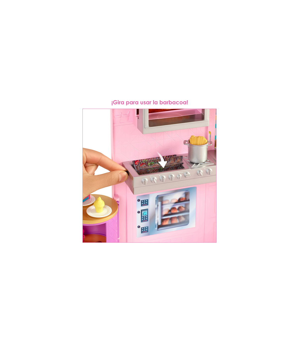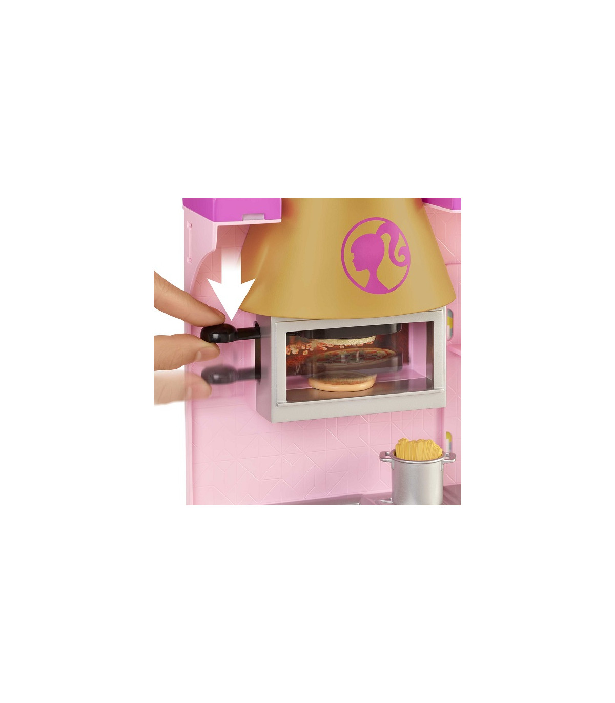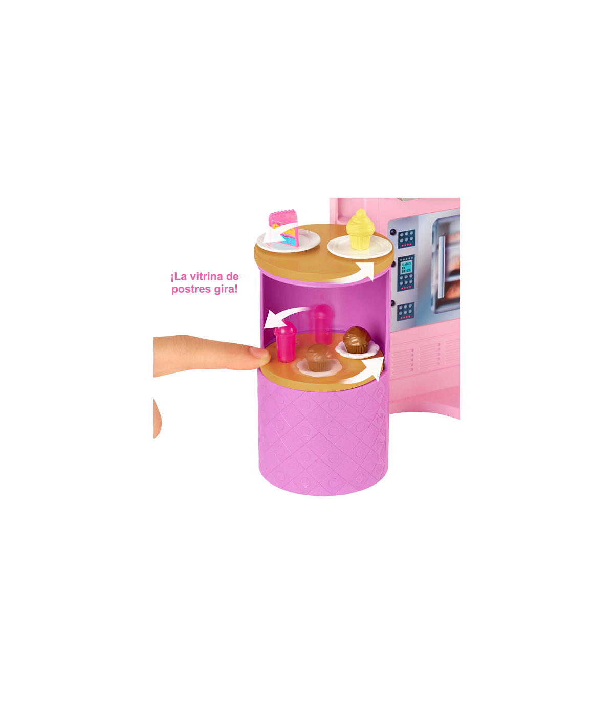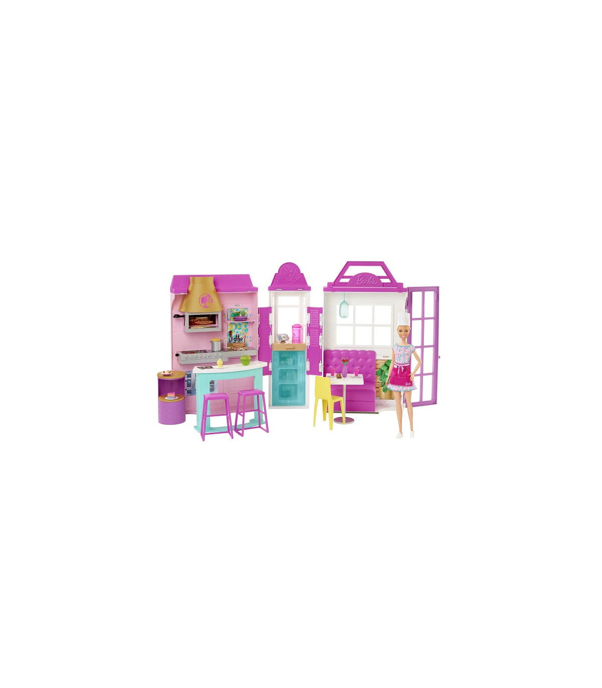 Con un diseño colorido y moderno, seis áreas de juego y más de 30 piezas en total, este conjunto inspirado en una cafetería permite disfrutar de un sinfín de historias. Barbie está preparada para un día de trabajo y diversión con un vestido, un adorable delantal rosa y un gorro de chef.