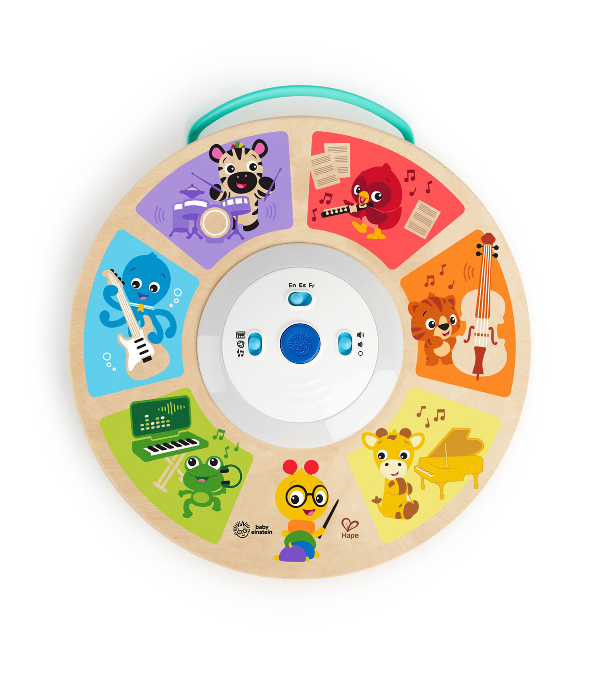 Esta base esférica de Baby Einstein de madera es una orquestra. Un juguete musical táctil y colorido donde cada tecla tiene un color, personaje e instrumento diferente para familiarizarse con los sonidos y combinaciones. Idioma: alemán, italiano e inglés.