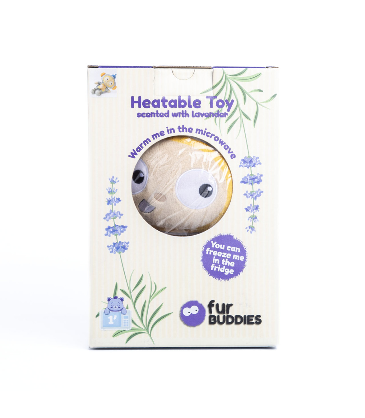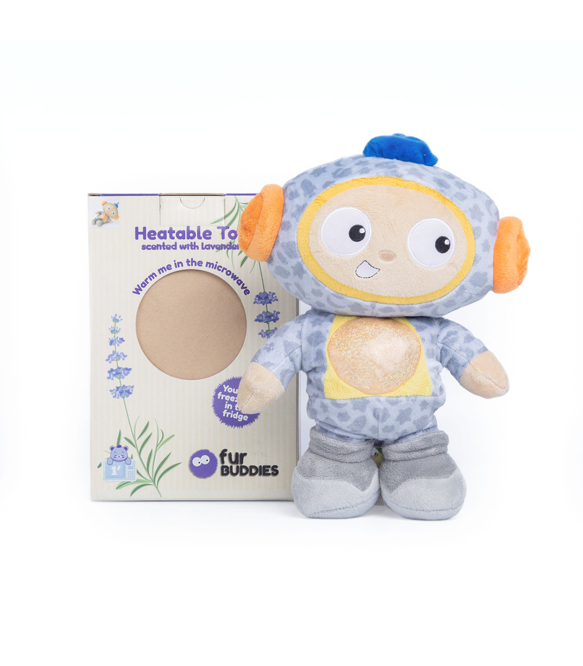 Muñeco de peluche térmico relleno con semillas y hierbas aromáticas de lavanda. Funciona como bolsa de agua caliente pero sin riesgo de quemaduras. Sólo se calienta 2 minutos en el microondas. También se puede usar frío conservándolo antes en el freezer.