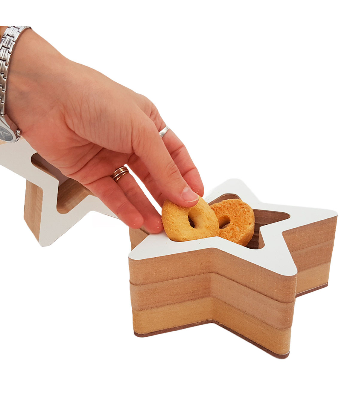 Un adorno de madera con forma de estrella de 6 cm de espesor con una estrella calada en el centro. Hecho en madera recuperada de los sobrantes de muebles hechos a medida.