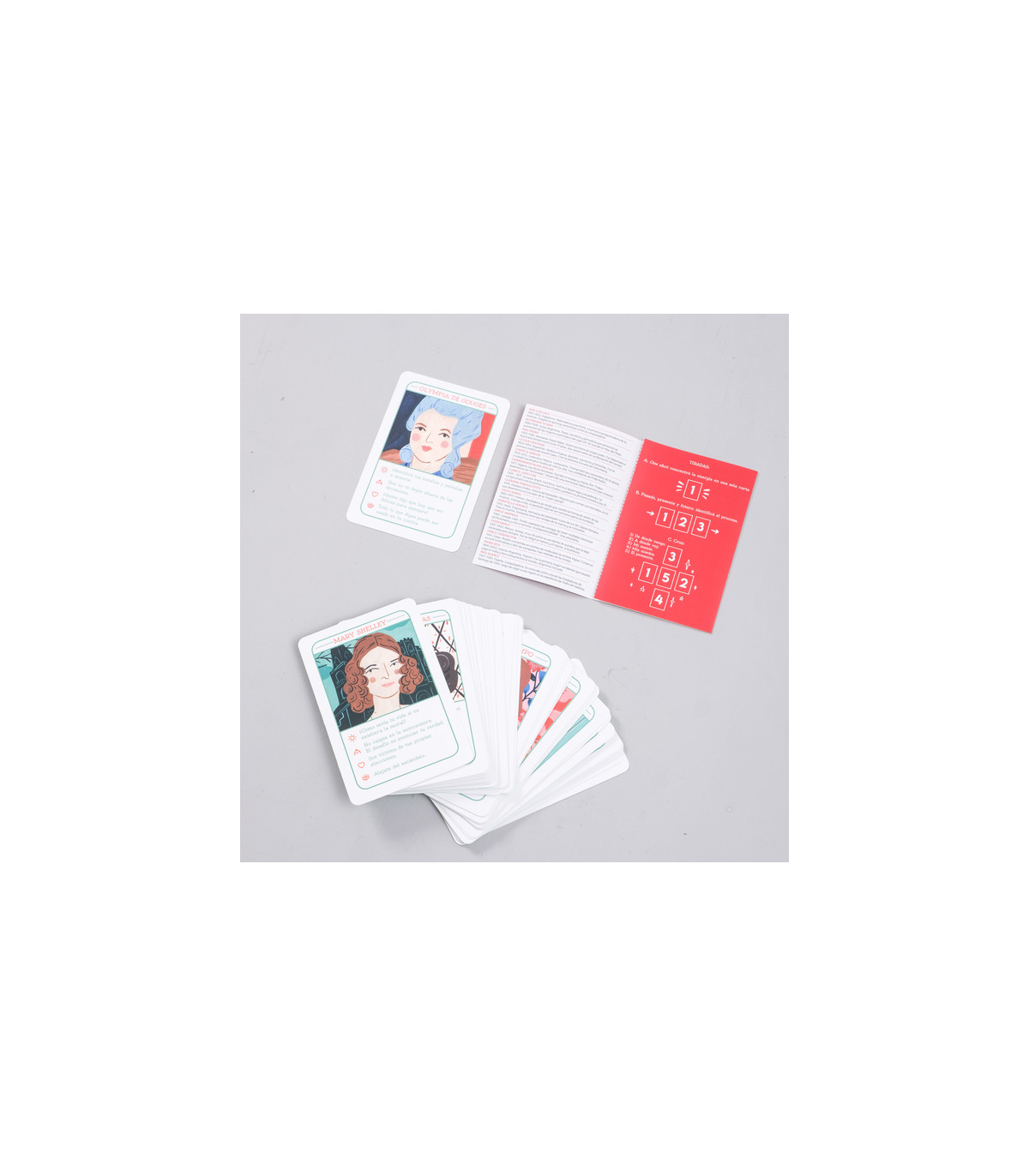 Este oráculo contiene 45 cartas ilustradas con mensajes de mujeres de la historia que forman parte de Mujeres autoras. Consultá el mensaje de: vida, trabajo/aula, amor y aprendizaje.